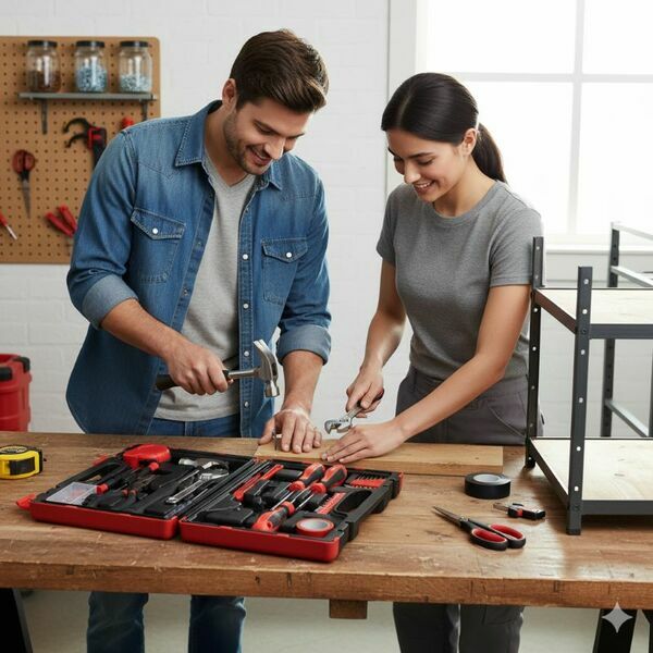 Praktyczny zestaw narzędzi umieszczony w poręcznej walizce. Zawartość zestawu: nóż uniwersalny, 8 szt. kluczy imbusowych, 10 końcówek wkrętakowych, 2 szt. wkrętaków, uchwyt do bitów, taśma izolacyjna do wiązek przewodów, nożyczki techniczne, próbnik napięcia, klucz nastawny 6”, młotek, szczypce wydłużone 6”, taśma samoprzylepna 3M, 2 szt. precyzyjnych wkrętaków, 80 szt. elementów złącznych (np: gwoździe, śruby, nakrętki, kołki itp.), walizka narzędziowa.