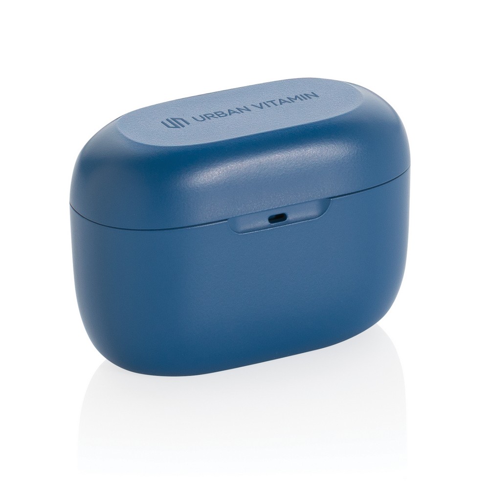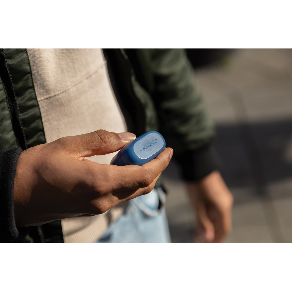 Bezprzewodowe słuchawki douszne, mocny i głęboki dźwięk, poziom redukcji szumów do 25 dB, wodoodporne IPX5 (całkowita ochrona przed strumieniem wody płynącej z różnych kierunków z wydajnością do 12,5 litra na minutę), dotykowy panel sterowania, wbudowany mikrofon, funkcja odbierania połączeń, do 5 godzin odtwarzania na jednym ładowaniu, etui ładujące zapewnia 18 godzin odtwarzania, nie zawiera PVC, opakowanie nie zawiera plastiku, ślad węglowy produktu: 1,02 kg CO2