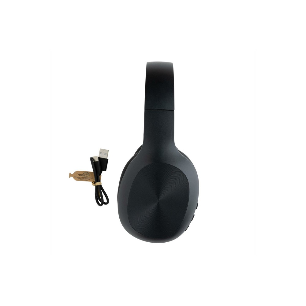 Nauszne słuchawki bezprzewodowe BT 5.1, składane, wykonane z ABS z recyklingu z certyfikatem RCS, całkowita zawartość materiałów z recyklingu obliczona na podstawie wagi całkowitej przedmiotu: 73%, wbudowany mikrofon, funkcja odbierania połączeń, wbudowany akumulator o pojemności 200 mAh umożliwia odtwarzanie muzyki do 5 godzin, ponowne ładowanie w 1,5 godziny, zasięg do 10 m, kabel z TPE z recyklingu w komplecie, w kraftowym pudełku z certyfikatem FSC® mix, nie zawiera PVC, ślad węglowy produktu: 1,11 kg CO2