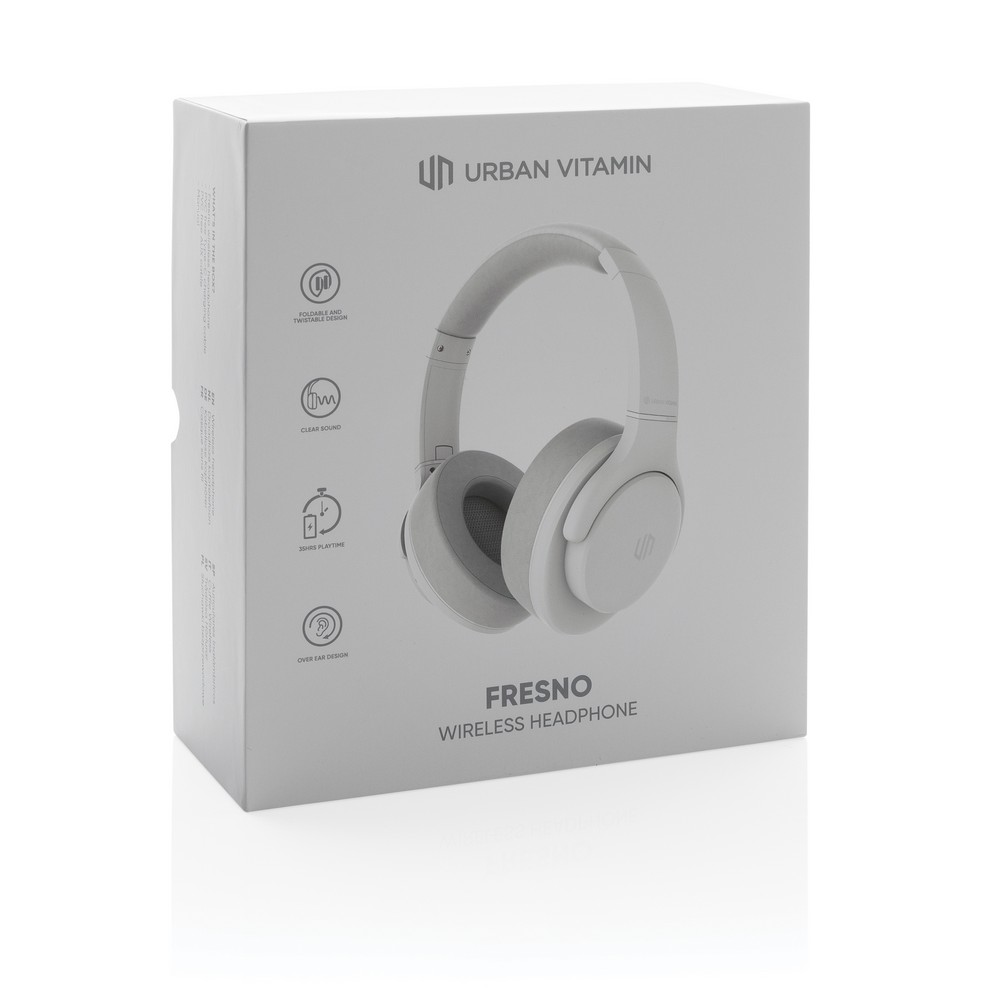 Nauszne słuchawki bezprzewodowe, składane, wbudowany mikrofon, funkcja odbierania połączeń, komfortowe nauszniki, czas odtwarzania na jednym ładowaniu do 35 godzin, nie zawiera PVC, opakowanie nie zawiera plastiku, ślad węglowy produktu: 2,47 kg CO2