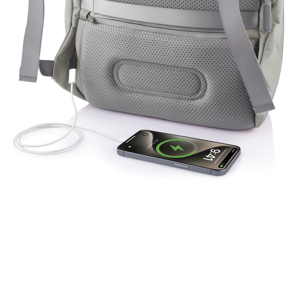Plecak chroniący przed kieszonkowcami Bobby Soft, wodoodporny materiał, wykonany z przyjaznego środowisku materiału RPET, ukryte zamki i kieszenie, kieszenie z ochroną RFID, przestronna przegroda główna z kieszeniami wewnątrz i miękką przegrodą na laptopa do 15,6", zintegrowany port USB do ładowania telefonów (power-bank nie jest dołączony), rozszerzalna górna część plecaka