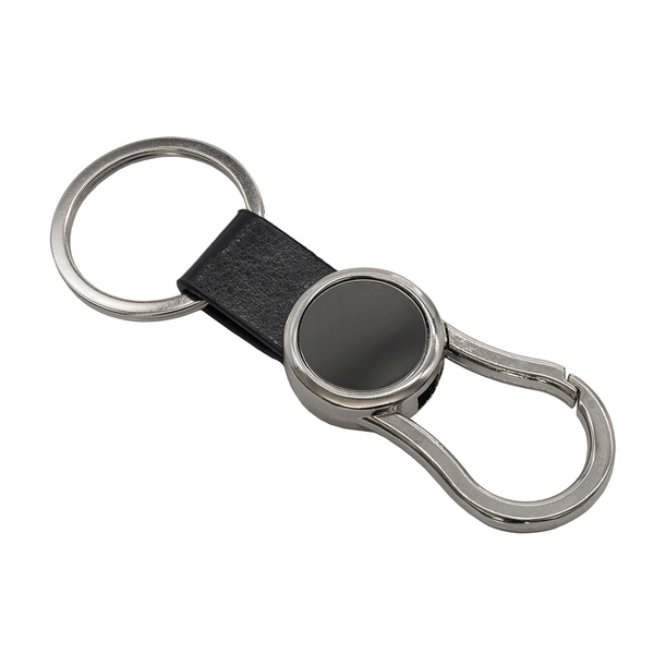 Brelok będący eleganckim połączeniem metalu i ekoskóry. Pakowany w czarne kartonowe opakowanie upominkowe.
