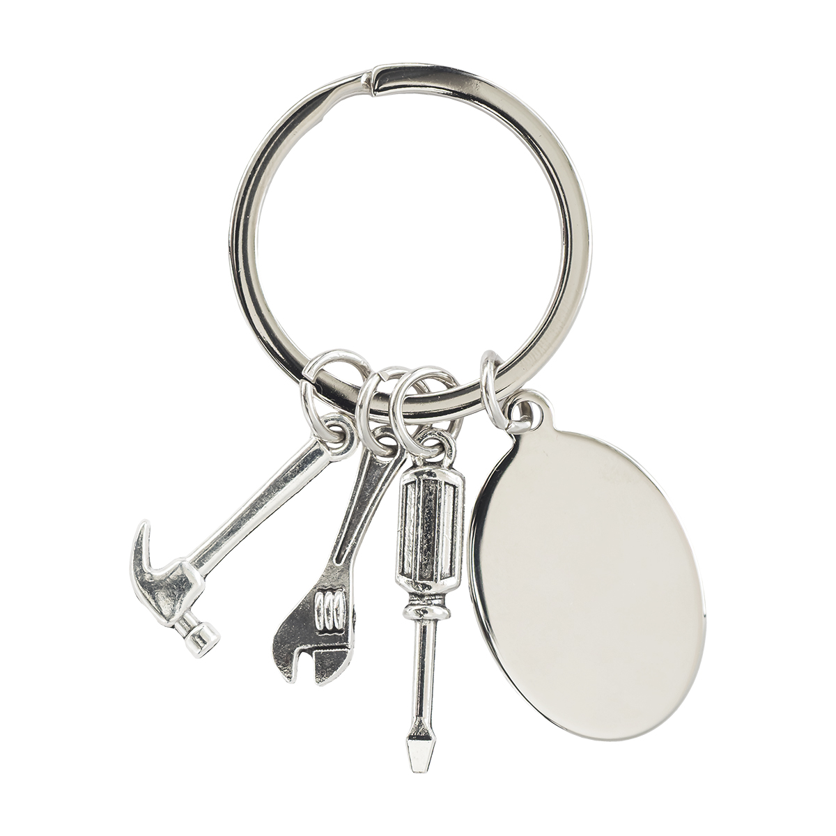 Metalowy brelok z elementami w kształcie narzędzi. Zawiera 3 zawieszki: śrubokręt, klucz francuski i młotek oraz płytkę idealna pod grawer. Pakowany w czarne opakowanie upominkowe.