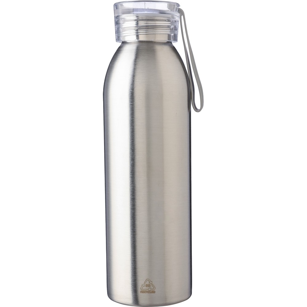 Butelka sportowa 650 ml wykonana ze stali nierdzewnej z recyklingu, zawiera pojedynczą ściankę, silikonowy uchwyt zwiększający wygodę użytkowania, ikona stali nierdzewnej recyklingu na produkcie, produkt zapakowany w brązowy kartonik