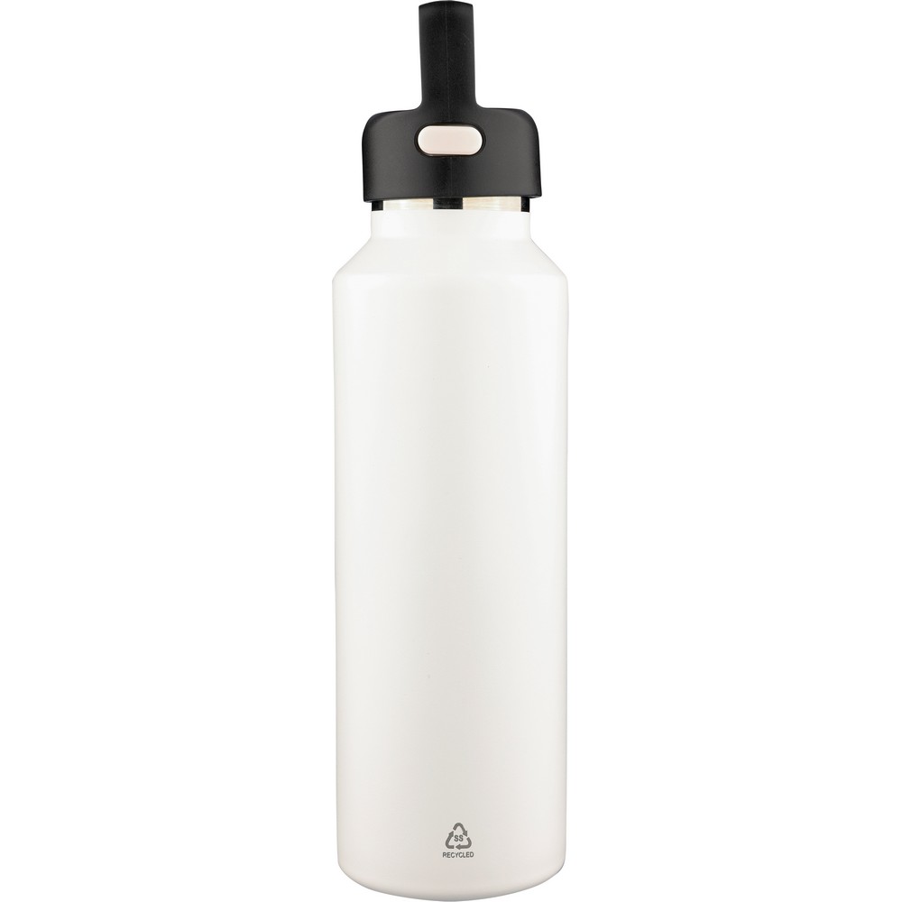Butelka termiczna 600 ml, posiada podwójne ścianki ze stali nierdzewnej z próżnią między ściankami, co spowalnia oddawanie temperatury na zewnątrz, zachowując funkcje termosu, uchwyt ułatwiający przenoszenie, zawiera przyciski po bokach do otwierania pokrywki, pakowany pojedynczo w brązowe kartonowe pudełko, produkt wykonany z recyklingowej stali nierdzewnej (wewnątrz 304 / na zewnątrz 201) z pokrywką z PP