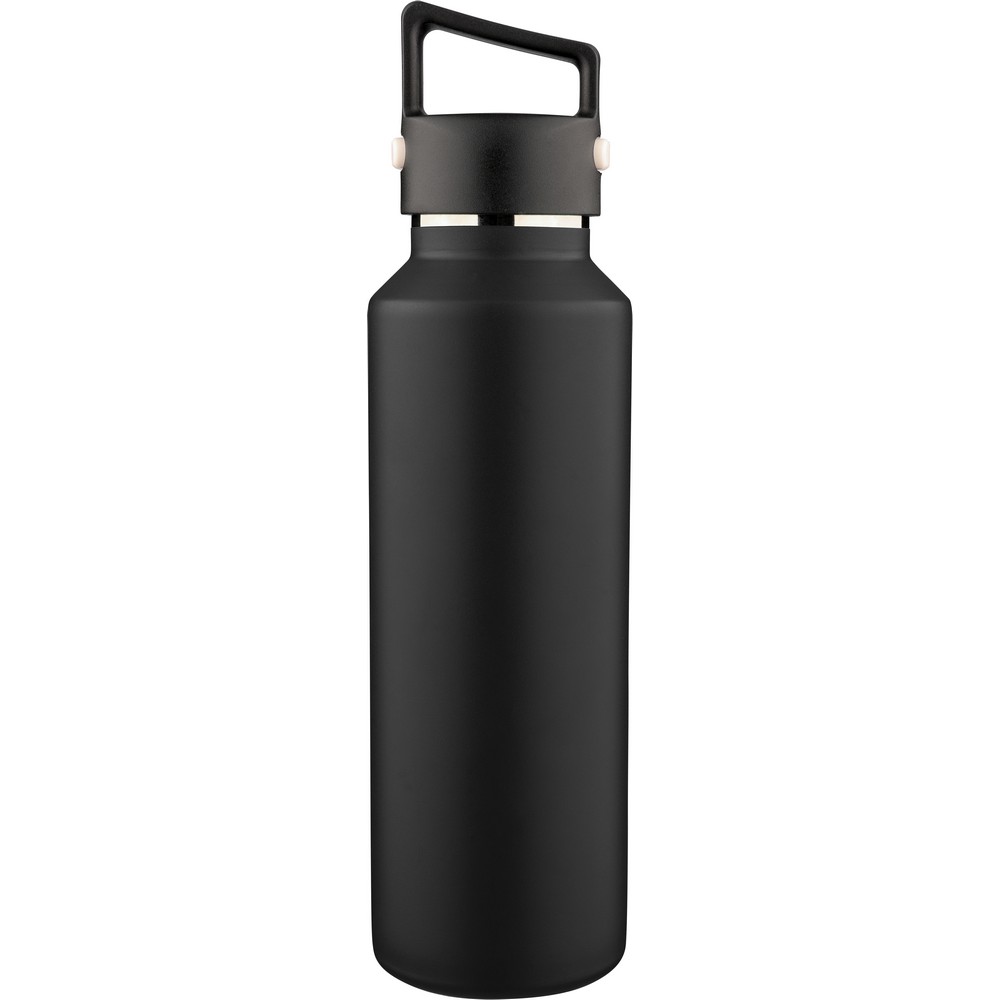 Butelka termiczna 600 ml, posiada podwójne ścianki ze stali nierdzewnej z próżnią między ściankami, co spowalnia oddawanie temperatury na zewnątrz, zachowując funkcje termosu, uchwyt ułatwiający przenoszenie, zawiera przyciski po bokach do otwierania pokrywki, pakowany pojedynczo w brązowe kartonowe pudełko, produkt wykonany z recyklingowej stali nierdzewnej (wewnątrz 304 / na zewnątrz 201) z pokrywką z PP