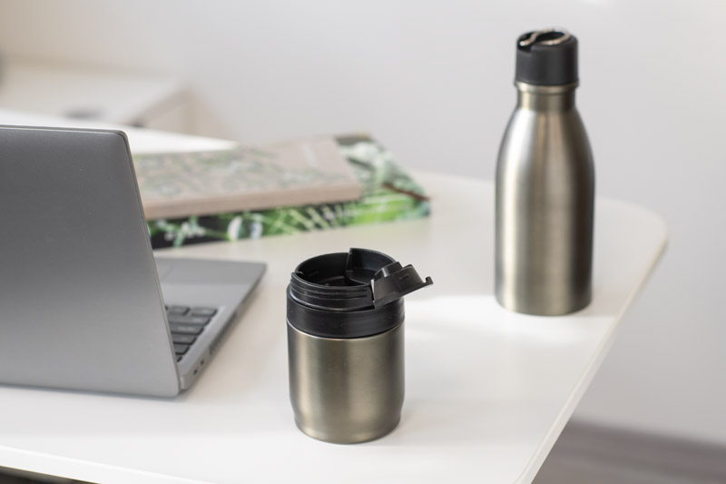 Butelka termiczna DRINNO ze stali nierdzewnej składa się z dwóch elementów (komór), które można rozdzielić i używać niezależnie. Górna część to butelka termiczna z zakrętką wyposażoną w składany uchwyt (500 ml), a dolna część to odkręcany kubek termiczny z pokrywką zamykaną na zatrzask (ok. 200 ml). Butelka utrzymuje temperaturę napoju do 10 godzin, dzięki czemu doskonale sprawdza się w pracy, w podróży i na co dzień. Całość tworzy funkcjonalne rozwiązanie do przechowywania ciepłych i zimnych napojów – idealne również jako praktyczny upominek reklamowy.
