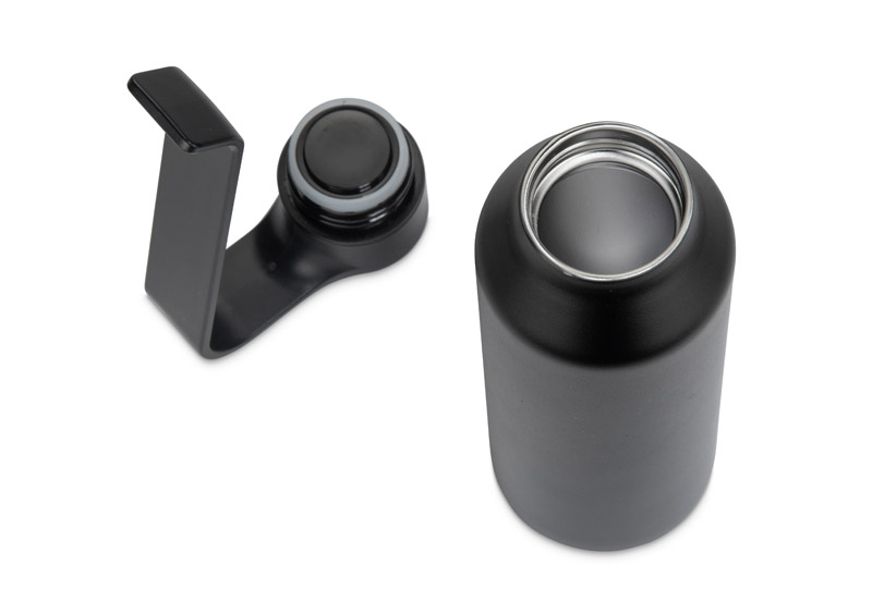 Butelka termiczna TIMI łączy nowoczesną formę z praktycznymi rozwiązaniami. Wykonana ze stali nierdzewnej, utrzymuje temperaturę napojów do 2 godzin i nadaje się zarówno do napojów zimnych, jak i ciepłych. Przy bardzo gorących lub wrzących napojach niektóre elementy mogą się nagrzewać, co stwarza ryzyko poparzenia — zaleca się więc ostrożność podczas użytkowania. Charakterystyczny, geometryczny uchwyt nie tylko ułatwia przenoszenie, ale także pełni funkcję stojaka na telefon lub haczyka do zawieszenia, np. na krześle czy kierownicy. Klasyczna, gwintowana zakrętka zapewnia wygodne otwieranie i szczelne zamknięcie. Prosty kształt i matowe wykończenie nadają jej minimalistyczny wygląd. To idealny wybór dla osób ceniących funkcjonalny design i możliwość personalizacji poprzez znakowanie.