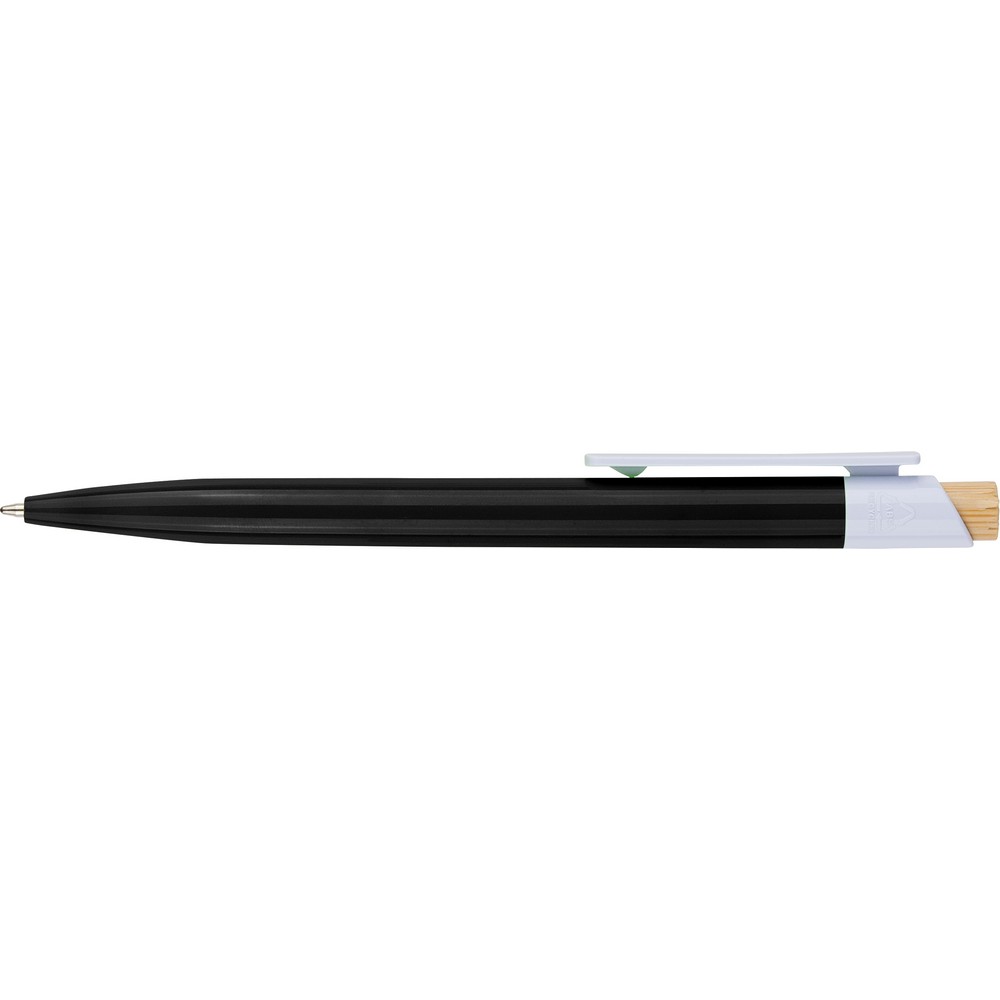 Długopis, bambusowy przycisk, metalowy klips, wkład w niebieskim kolorze, ikona recyklingu na produkcie, wystarcza na ok. 600 m pisania, produkt wykonany z ABS z recyklingu, aluminium i bambusa
