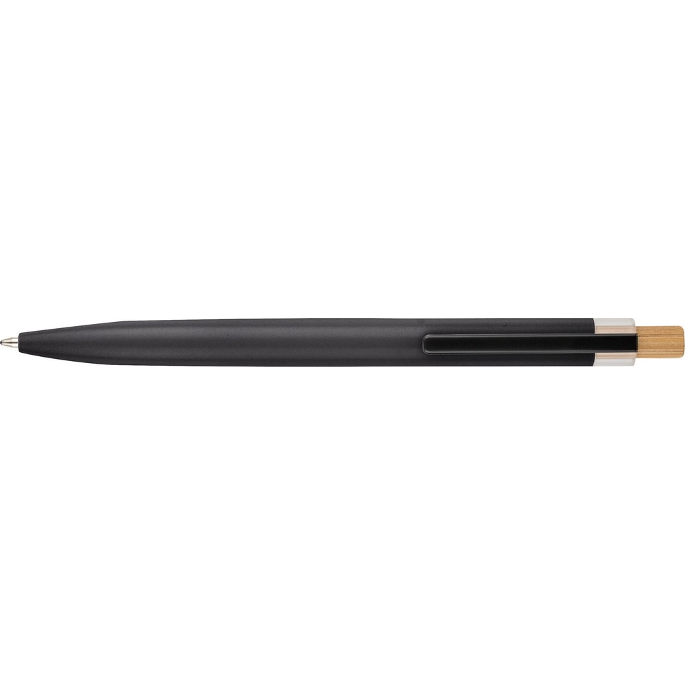 Długopis, wkład w niebieskim kolorze, wystarcza na ok. 700 m pisania, ikona recyklingu na produkcie, produkt wykonany z aluminium, RPET i z przyciskiem z bambusa