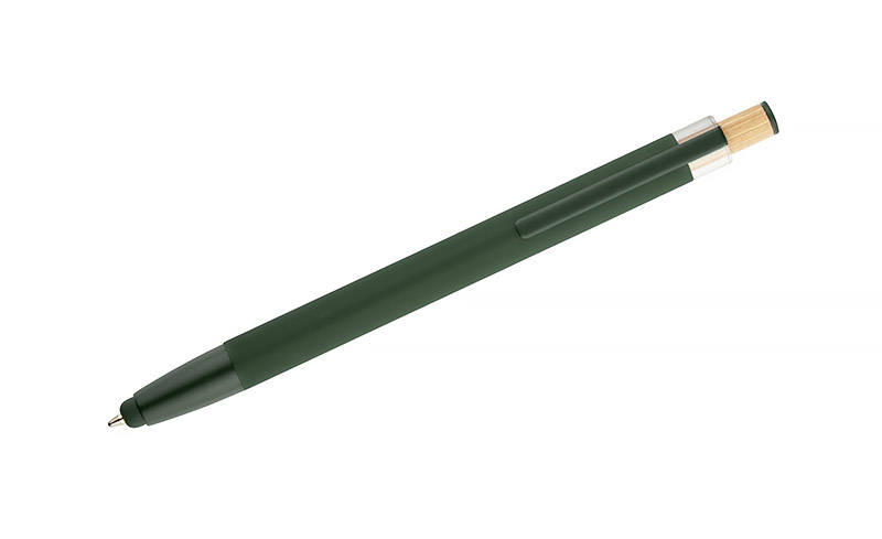 Długopis ALPEN to połączenie nowoczesnego designu i wygody pisania. Wykonany z recyklingowanego aluminium z miękkim w dotyku, gumowanym wykończeniem typu soft touch, zapewnia komfortowe użytkowanie każdego dnia. Wyposażony jest w funkcję touch pena do obsługi ekranów dotykowych oraz metalowy klip, który ułatwia przypięcie do notesu lub kieszeni. Charakterystyczny guzik z bambusa dodaje całości naturalnego akcentu, a kolorowe detale podkreślają jego nowoczesny styl. Wkład typu G2 o grubości linii 1,0 mm gwarantuje płynne pisanie i wysoką trwałość.