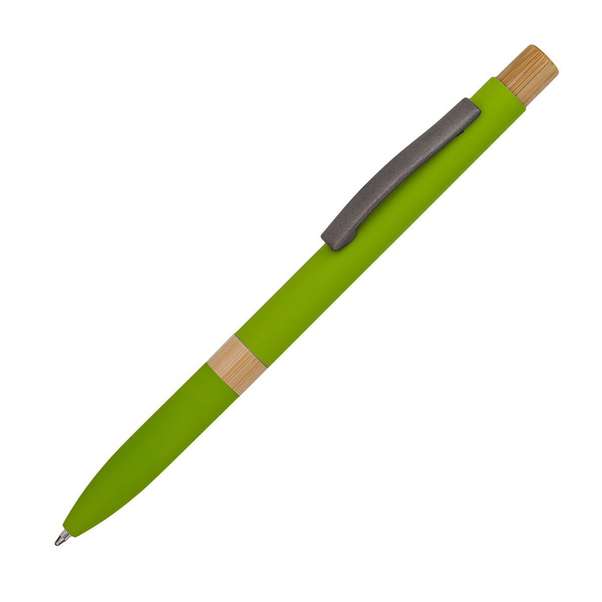 Długopis o satynowym wykończeniu, ozdobiony bambusowymi elementami. Niebieski wkład.