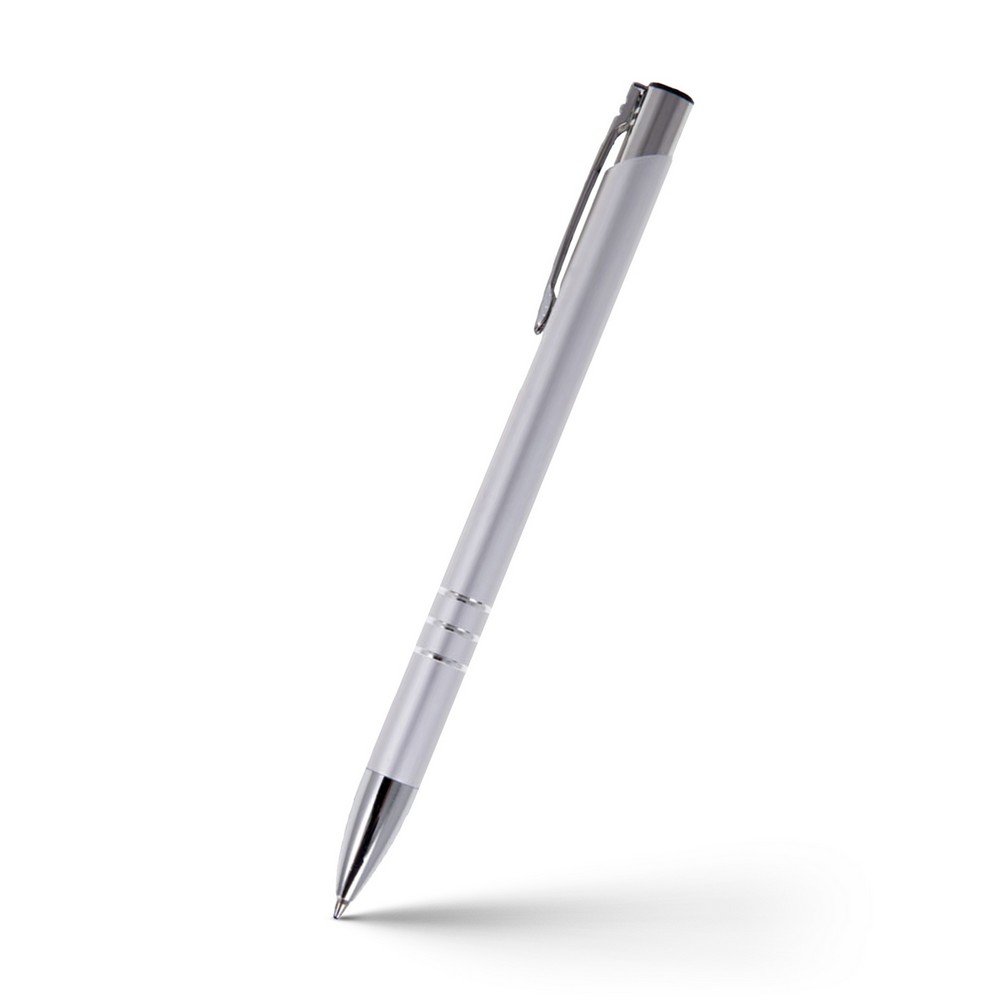 Długopis z kolorowym trzonem o błyszczącym wykończeniu, posiada elementy w srebrnym kolorze, wkład w niebieskim kolorze, produkt wykonany z aluminium