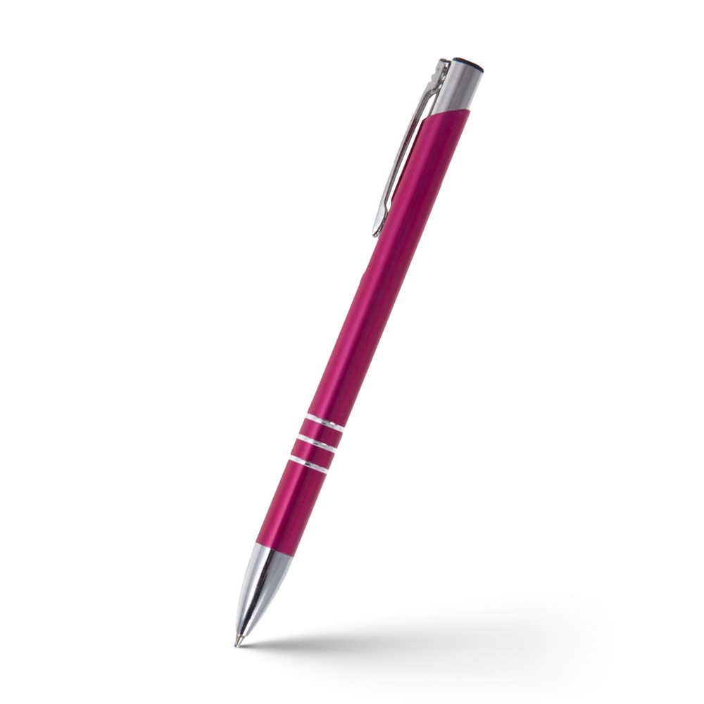 Długopis z kolorowym trzonem o błyszczącym wykończeniu, posiada elementy w srebrnym kolorze, wkład w niebieskim kolorze, produkt wykonany z aluminium