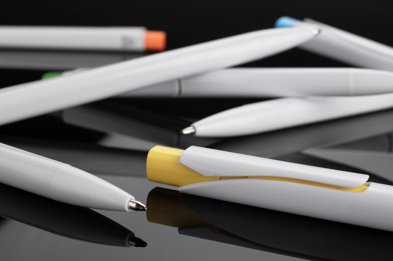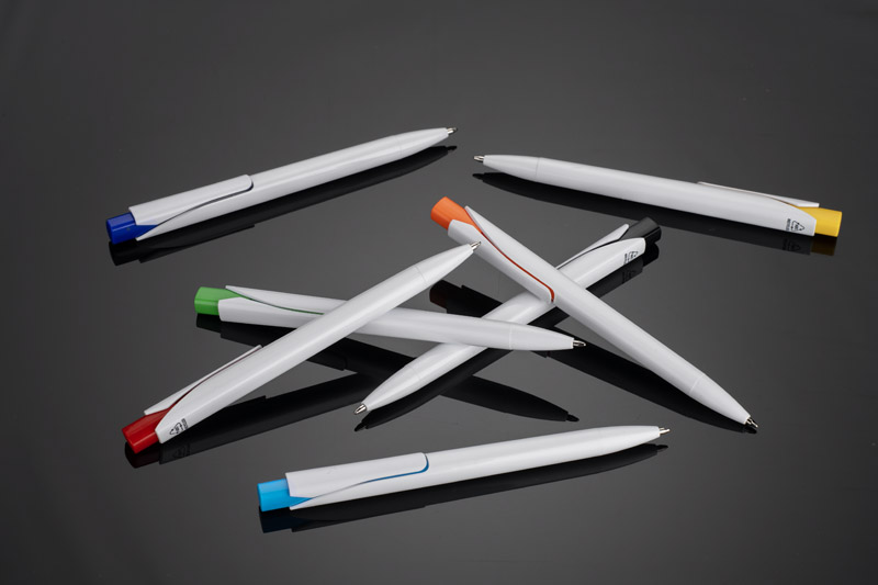 Długopis KLIBO wykonany jest z tworzywa rABS w klasycznym białym kolorze, z lakierowanym wykończeniem. Wyróżnia go kwadratowy, kolorowy przycisk oraz wąski, płaski klip, który pewnie trzyma się dokumentów i notesów. Mechanizm automatyczny zapewnia wygodne użytkowanie, a wkład typu G2 o grubości pisania 1,0 mm gwarantuje płynny i równy zapis. Lekka konstrukcja i nowoczesna forma sprawiają, że KLIBO to praktyczny gadżet reklamowy do codziennego użytku.