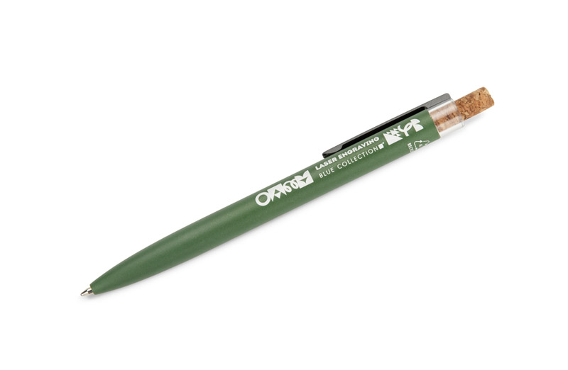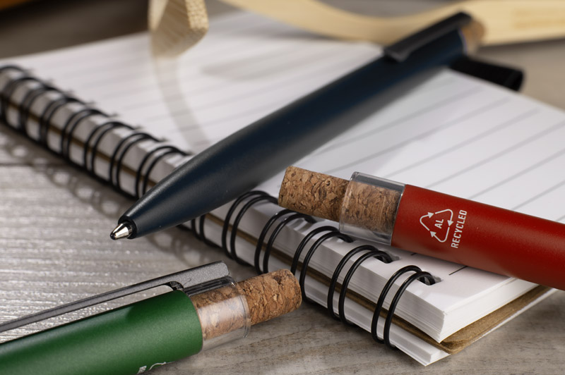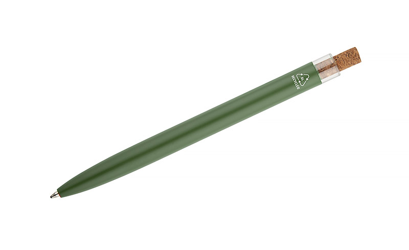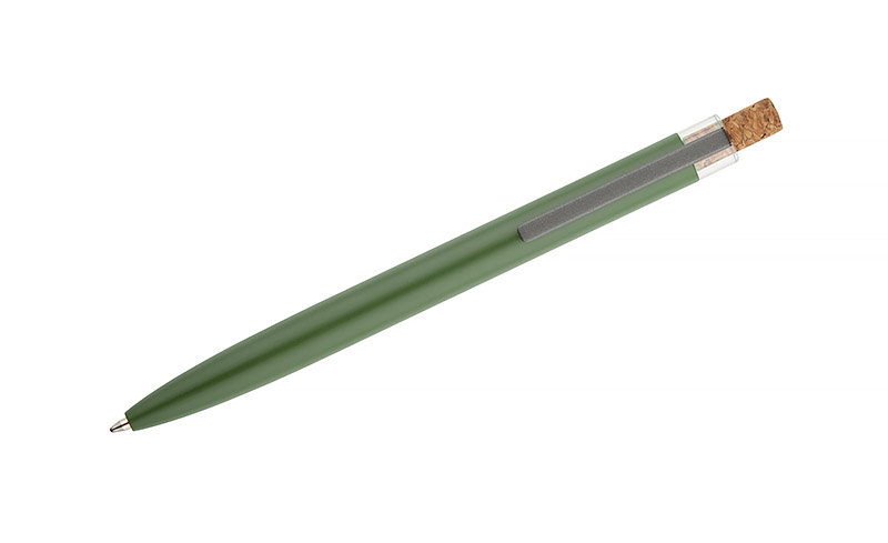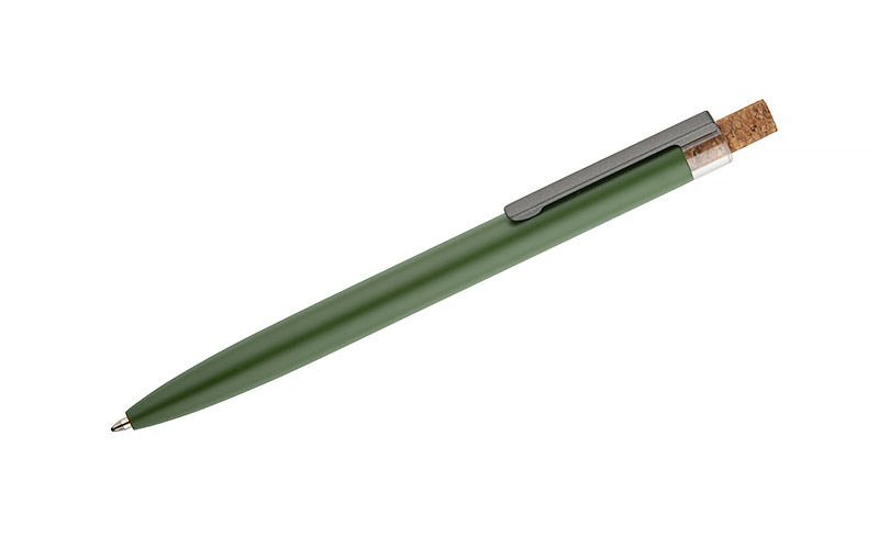 Długopis KORIN wykonany jest z recyklingowanego aluminium i pokryty lakierowanym wykończeniem, które nadaje mu gładką, satynową powierzchnię. Wyposażony w automatyczny mechanizm, wkład typu G2 o grubości pisania 1,0 mm oraz metalowy klips w kolorze grafitowym. Korkowy przycisk stanowi ciekawy akcent, podkreślający nowoczesny charakter długopisu. KORIN jest lekki, solidny i wygodny w codziennym użytkowaniu.