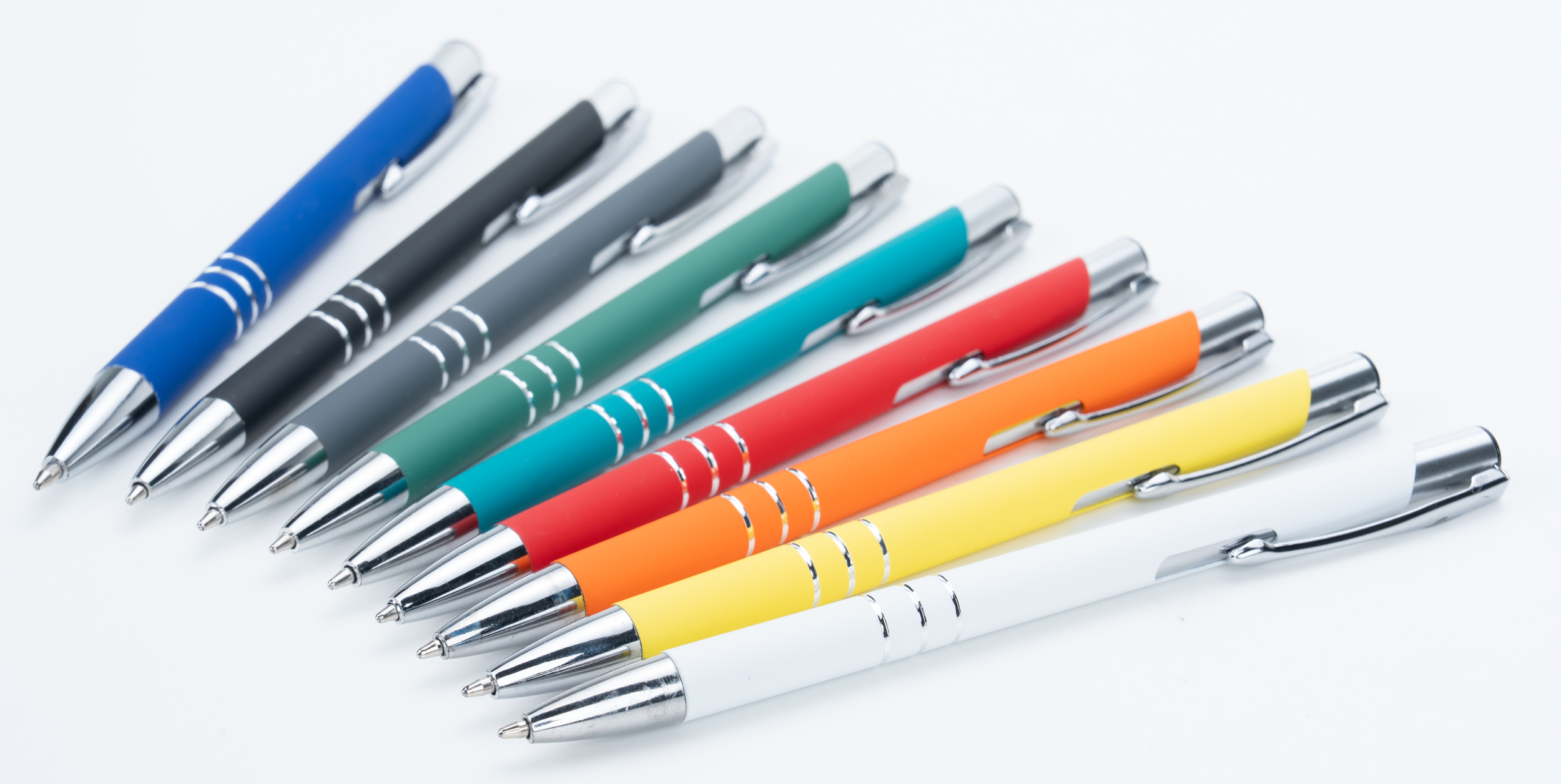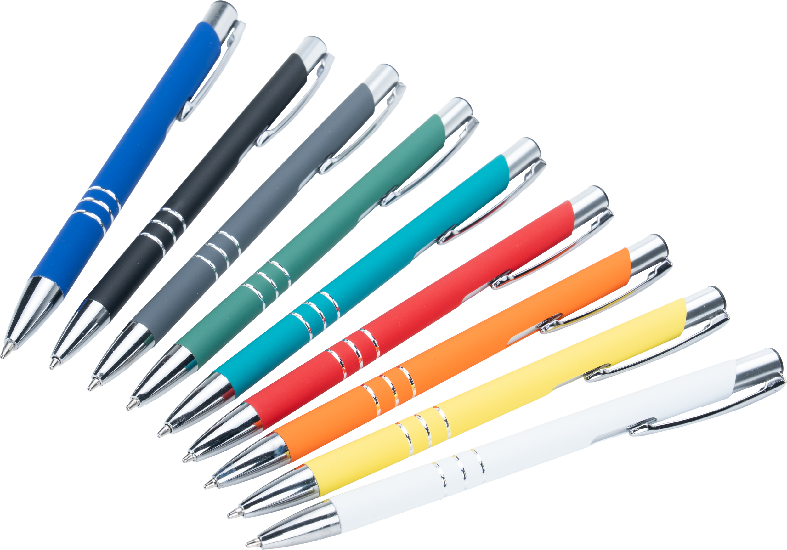 Metalowy długopis z gumową powierzchnią, piszący na niebiesko. Długopisy dostępne w bogatej gamie kolorystycznej.