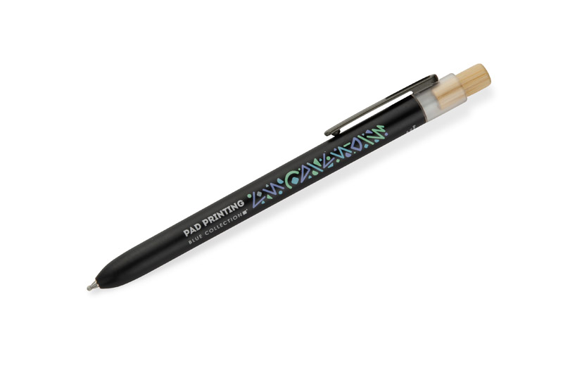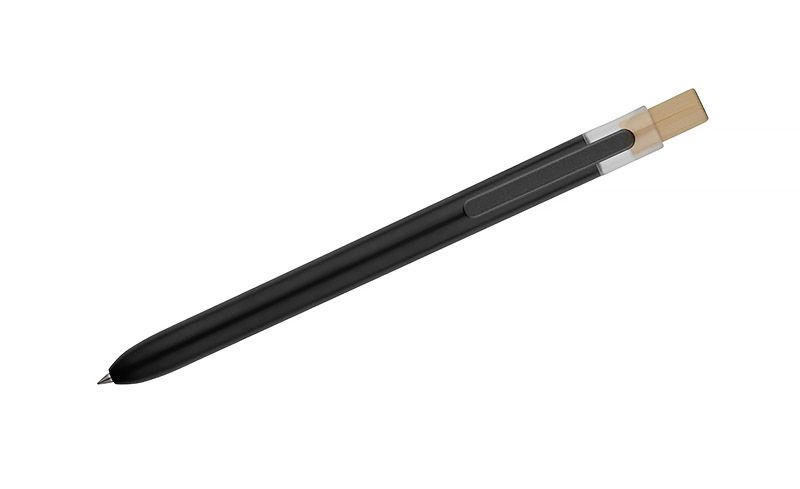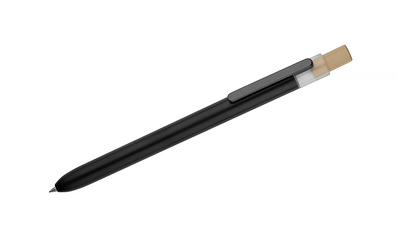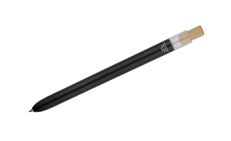 Długopis OCEANO wykonany jest z materiału pochodzącego z odpadów ocean bound – tworzyw zbieranych z terenów przybrzeżnych, zanim trafią do mórz i oceanów. Posiada lakierowany korpus, bambusowy przycisk oraz metalowy klips, co nadaje mu nowoczesny wygląd i przyjemne w użytkowaniu wykończenie. Automatyczny mechanizm ułatwia codzienną obsługę, a wkład typu G2 z żelowym tuszem o grubości pisania 0,5 mm zapewnia płynny i precyzyjny zapis.
