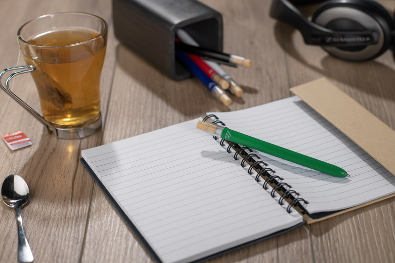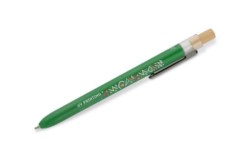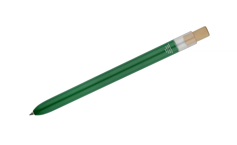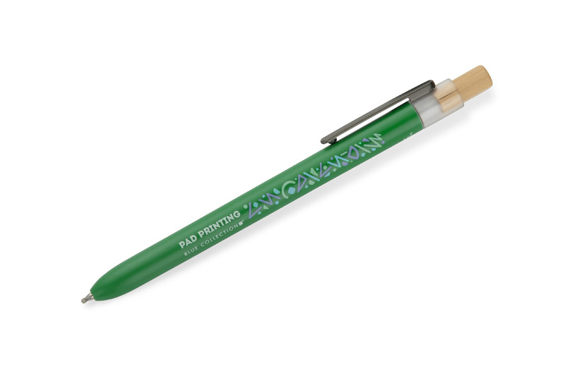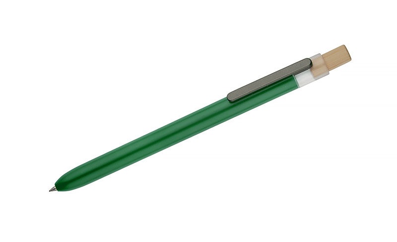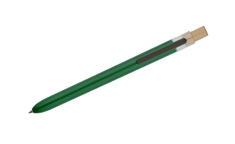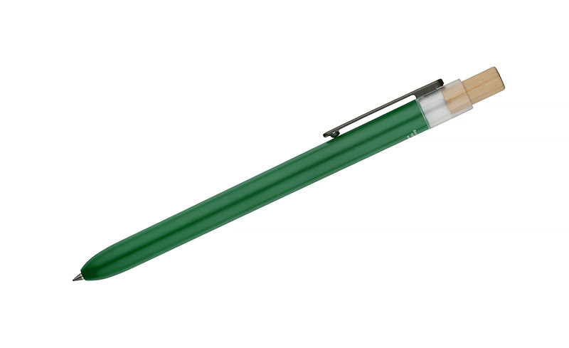 Długopis OCEANO wykonany jest z materiału pochodzącego z odpadów ocean bound – tworzyw zbieranych z terenów przybrzeżnych, zanim trafią do mórz i oceanów. Posiada lakierowany korpus, bambusowy przycisk oraz metalowy klips, co nadaje mu nowoczesny wygląd i przyjemne w użytkowaniu wykończenie. Automatyczny mechanizm ułatwia codzienną obsługę, a wkład typu G2 z żelowym tuszem o grubości pisania 0,5 mm zapewnia płynny i precyzyjny zapis.