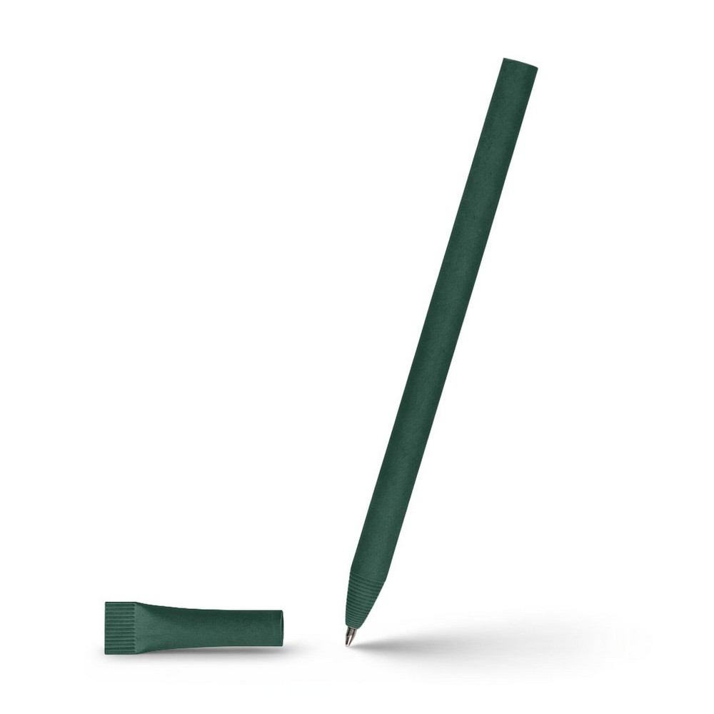 Długopis z dopasowaną kolorystycznie zatyczką, trzon z ciętym zakończeniem, wkład w niebieskim kolorze, produkt wykonany ze zrolowanego papieru
