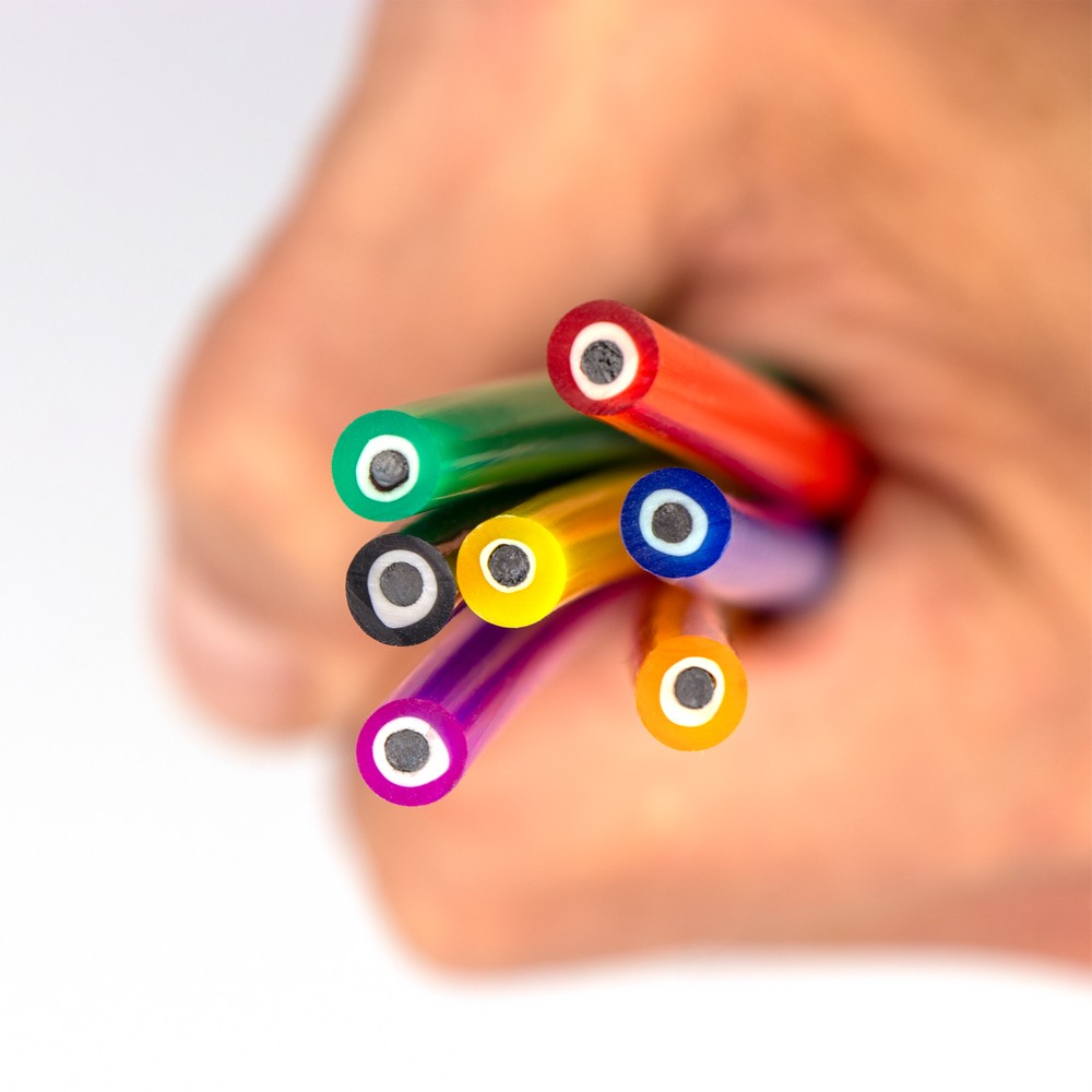 Długi, elastyczny ołówek z błyszczącym wykończeniem i dopasowaną kolorystycznie gumką, giętka budowa odznacza się większą odpornością na złamanie oraz może pomóc w rozładowaniu stresu, końcówka nie jest naostrzona, produkt wykonany z PVC