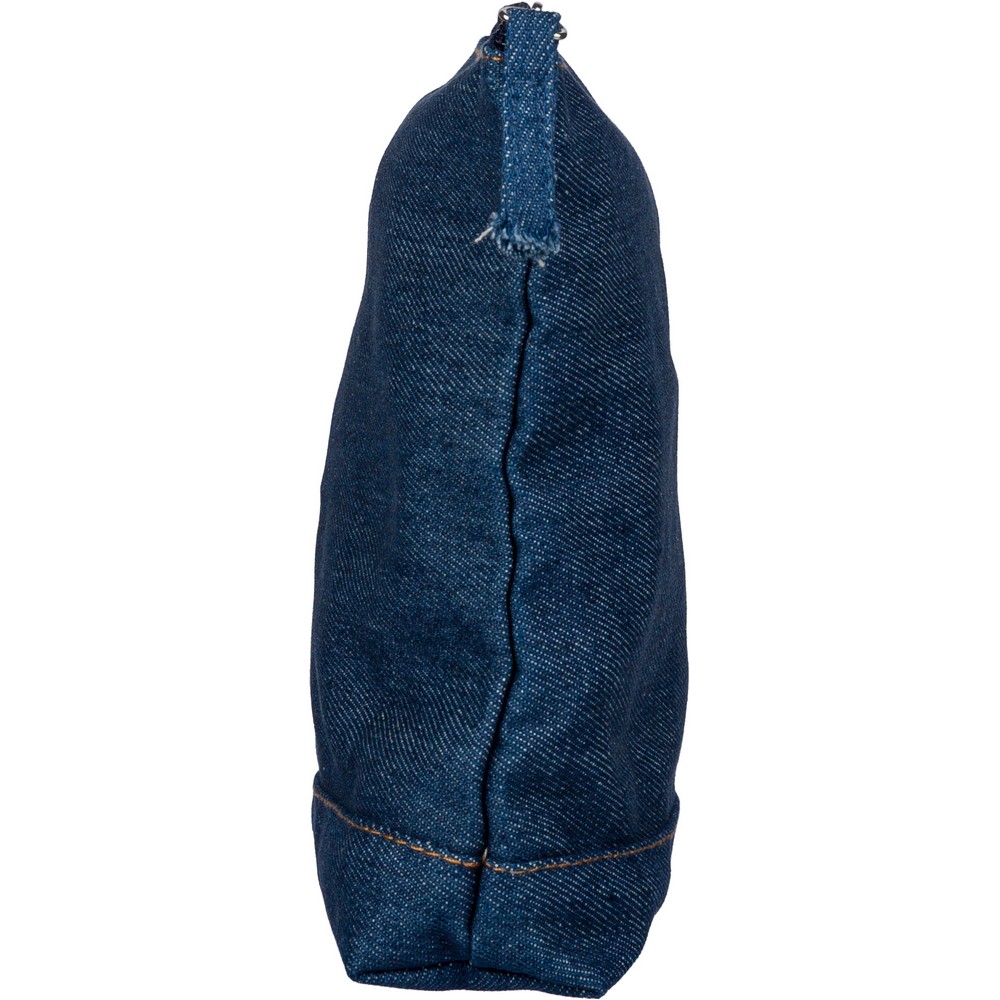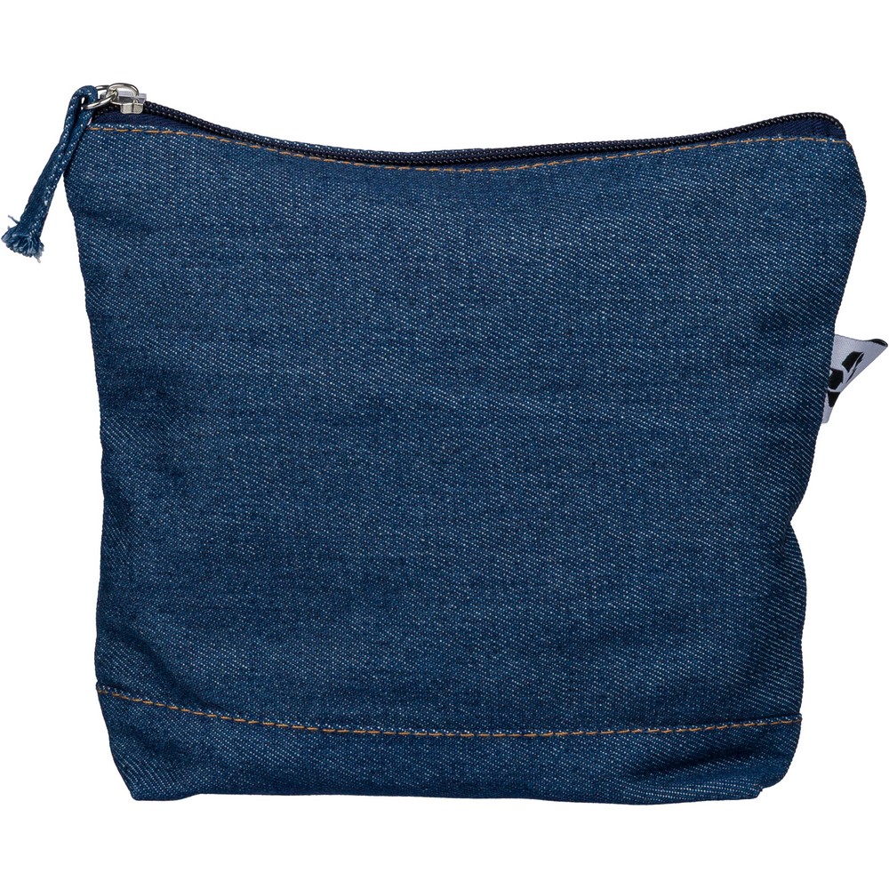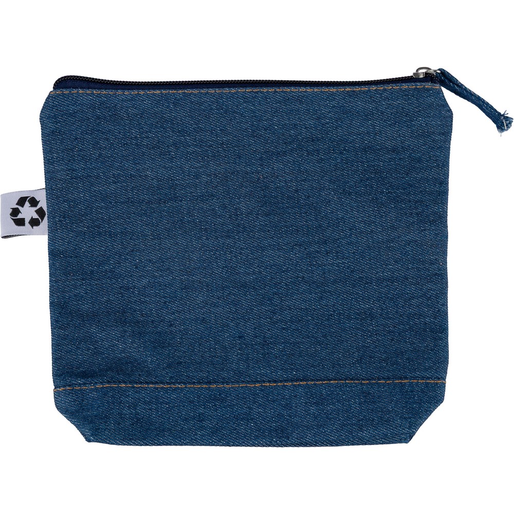 Kosmetyczka, kieszeń zapinana na zamek, ikona recyklingu na metce, produkt wykonany z denimu z recyklingu