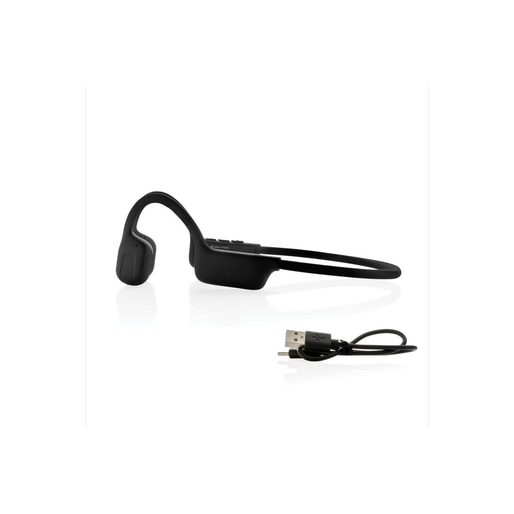 Kostne słuchawki bezprzewodowe, wodoodporne IPX4 (całkowita ochrona przed spryskiwaniem i zachlapaniem wodą z różnych kierunków z natężeniem do 10 litrów na minutę), wbudowany mikrofon, funkcja odbierania połączeń, wykonane z ABS z recyklingu z certyfikatem RCS, całkowita zawartość materiałów z recyklingu obliczona na podstawie wagi całkowitej przedmiotu: 17%, dzięki unikalnej, otwartej konstrukcji słuchawek nie umieszcza się w uchu, a dźwięk jest przekazywany za pomocą wibracji, do 10 godzin na jednym ładowaniu, opakowanie o zmniejszonej zawartości plastiku, nie zawiera PVC, ślad węglowy produktu: 1,51 kg CO2