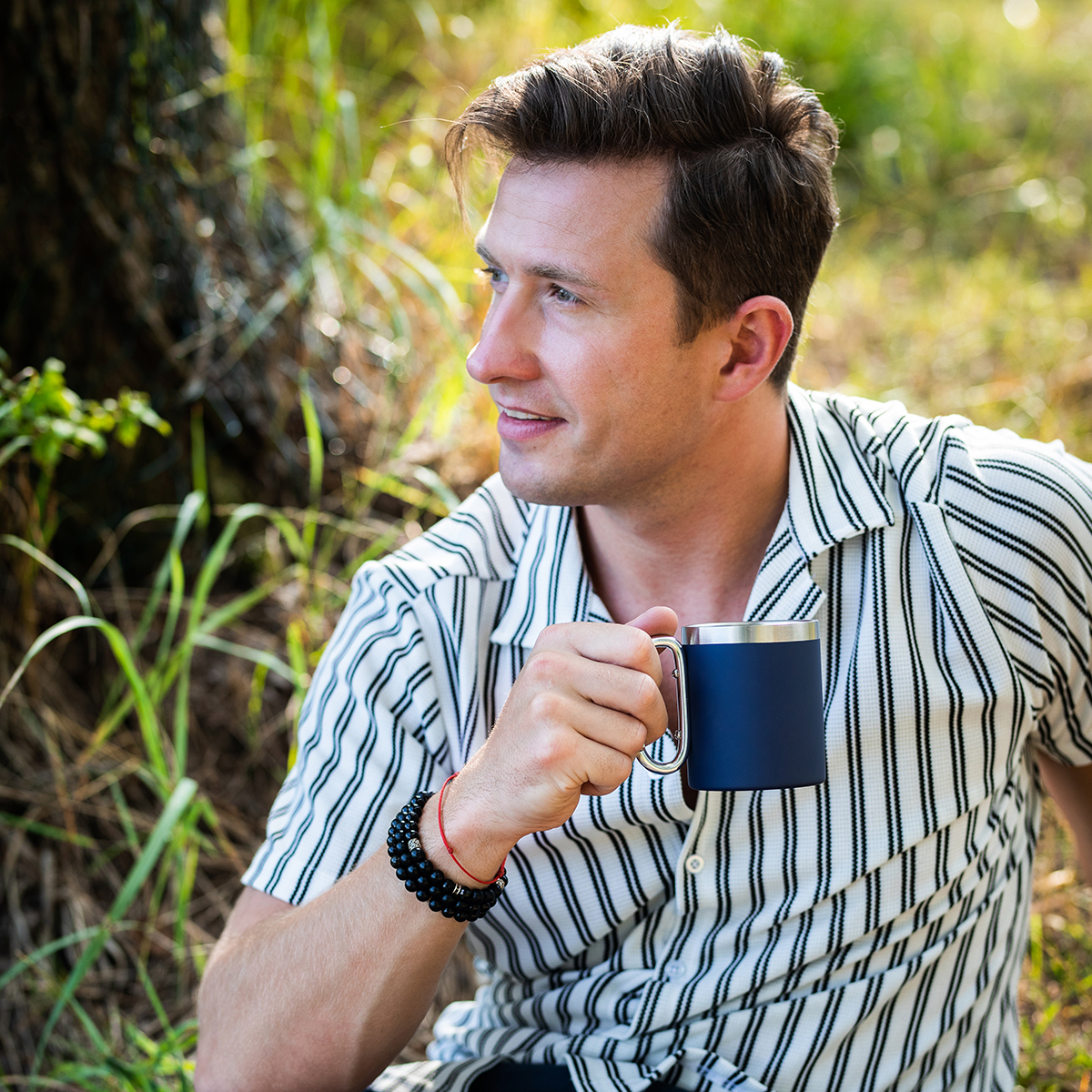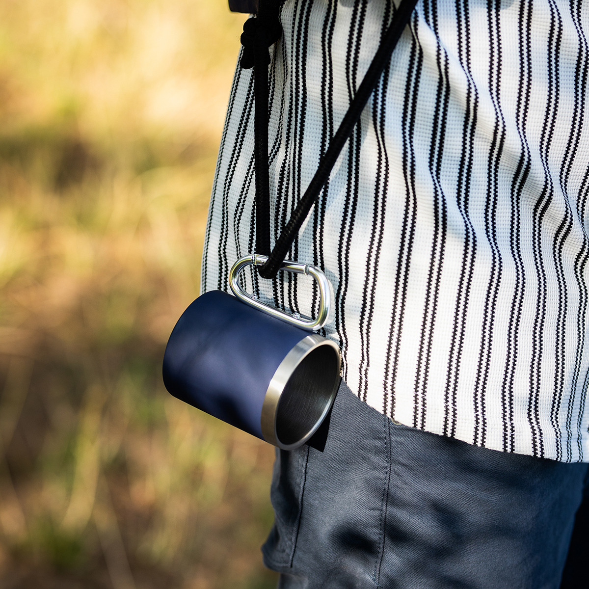 Kubek ze stali nierdzewnej o podwójnych ściankach, o przyjemnej w dotyku powierzchni. Kubek posiada uchwyt w formie karabińczyka. Pojemność: 300 ml.