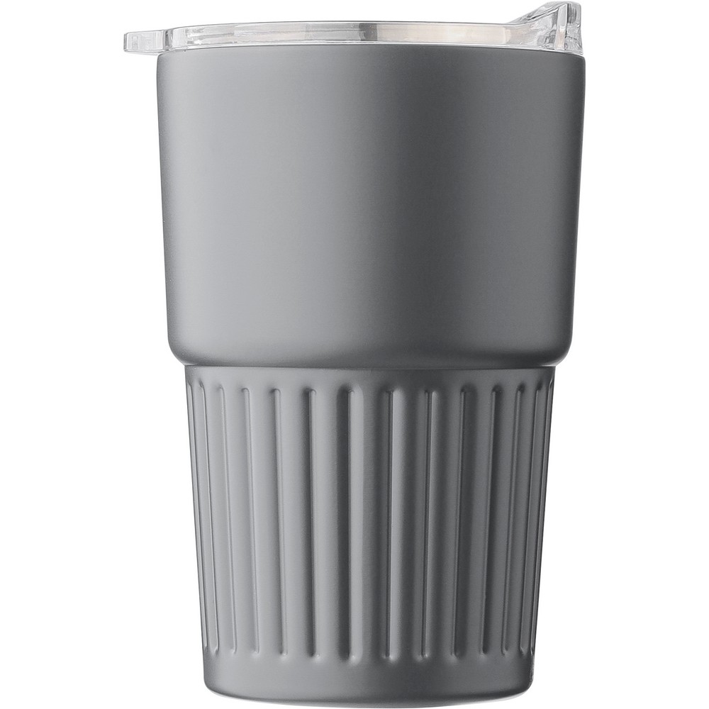 Kubek termiczny 450 ml ze stali nierdzewnej, posiada podwójne ścianki, które spowalniają oddawanie temperatury na zewnątrz, zewnętrzna część wykonana jest ze stali nierdzewnej 201, a wewnętrzna ścianka ze stali nierdzewnej 304, uchwyt ułatwiający noszenie, wieczko z zamknięciem wykonane z AS, ikona recyklingu na produkcie, zapakowany w brązowe kartonowe pudełko