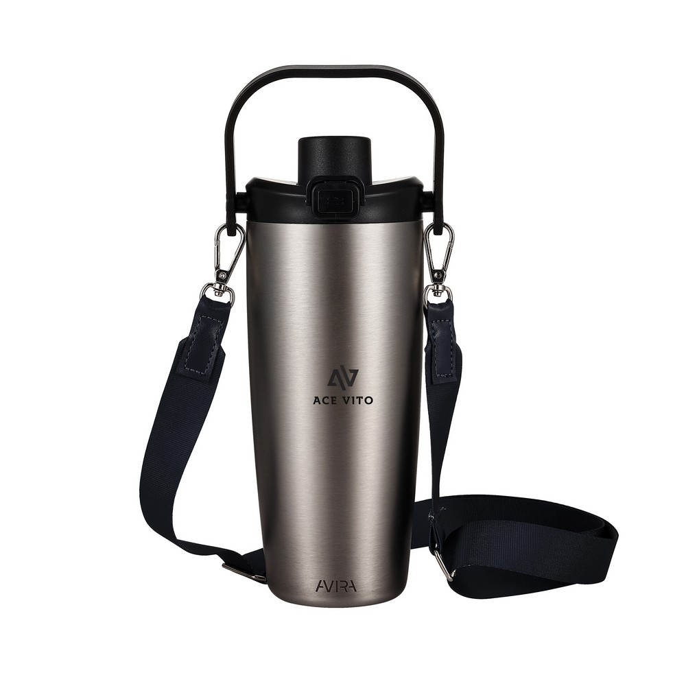 Kubek termiczny 600 ml, posiada ustnik, słomkę oraz pasek do noszenia, nie wymaga obsługi oburącz, podwójne ścianki ze stali nierdzewnej z próżnią pomiędzy, wykonany ze stali nierdzewnej z recyklingu z certyfikatem RCS