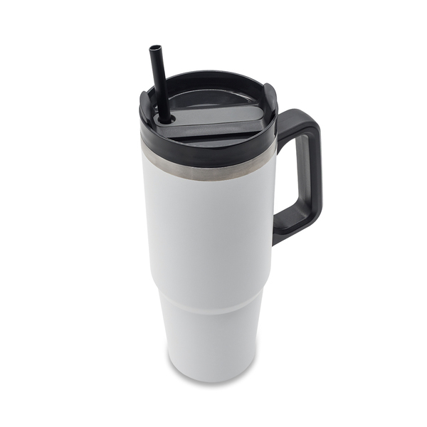 Kubek próżniowy z dwiema ściankami ze stali nierdzewnej. Wieczko z zamykanym otworem do picia i słomką. Posiada rączkę do wygodnego trzymania kubka. Sprawdzi się w podróży, pracy, czy na spacerach, zapewniając nawodnienie na długi czas dzięki dużej pojemności. Utrzymuje temperaturę powyżej 40°C przez 6 godzin.