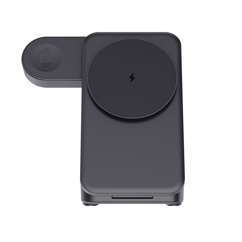 Magnetyczna ładowarka bezprzewodowa 15W 3 w 1, ładowarka bezprzewodowa 15W do telefonu, ładowarka bezprzewodowa 5W do słuchawek, ładowarka bezprzewodowa 2,5W do ładowania smartwatchy (kompatybilne wyłączenie z urządzeniami iOS), wskaźnik ładowania, 15 wbudowanych magnesów, działa z telefonami posiadającymi możliwość ładowania indukcyjnego, wejście USB-C 9V/2.2A, kabel 120 cm USB-C do USB-C w komplecie, wykonana z ABS z recyklingu, całkowita zawartość materiałów z recyklingu obliczona na podstawie wagi całkowitej przedmiotu: 34%