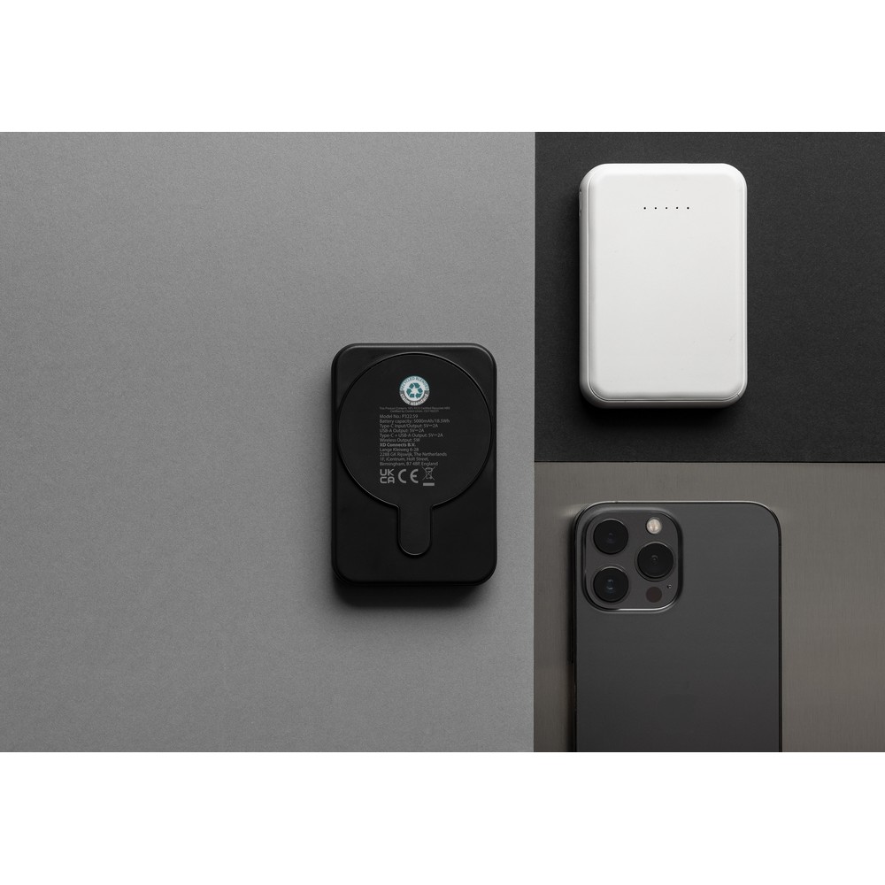 Magnetyczny bezprzewodowy power bank 5000 mAh, 5W Stellar, wykonany z certyfikowanego tworzywa RCS z recyklingu, wskaźnik poziomu naładowania, bateria litowo-polimerowa klasy A, wejście USB-C 5V/2.4A, wyjścia USB-C i USB-A 5V/2A, ładowarka magnetyczna, kabel z certyfikowanego TPE z recyklingu, opakowanie FSC® mix, bez PVC