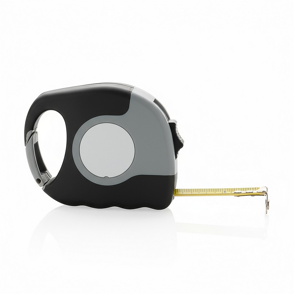 Miara 5 m z karabińczykiem, przycisk samozamykający, żółta taśma o szerokości 19 mm z dwoma silnymi magnesami na zaczepie, obudowa wykonana z ABS, uchwyt z TPR, posiada klip do paska, na obudowie matowa naklejka z PVC pod nadruk, wzór zastrzeżony®, ślad węglowy produktu: 1,38 kg CO2