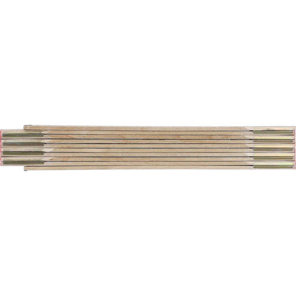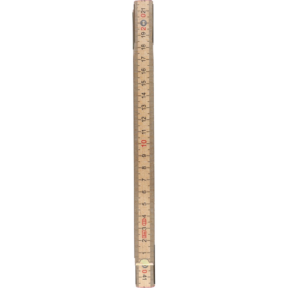 Miara 2m, składana, pomiar w cm, 10 segmentów, stalowe zawiasy, narożne zamknięcie, zapakowana w papierowy rękaw, produkt wykonany ze stali i drewna brzozowego