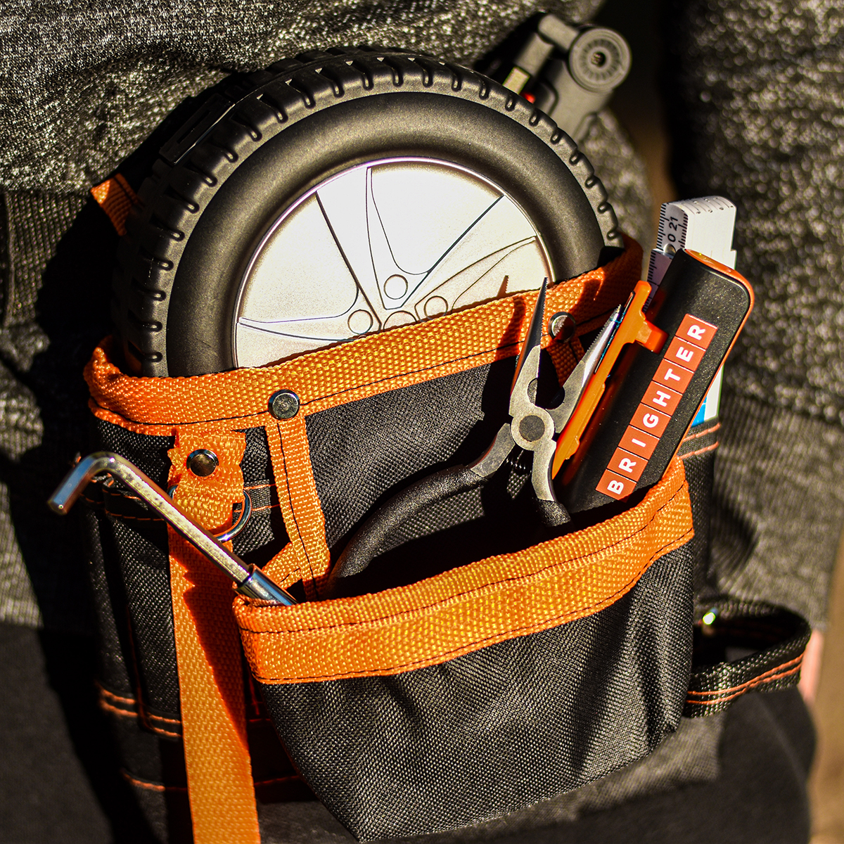 Monterski pas na narzędzia. Posiada dużą przegrodę główną, przednią kieszeń, 8 zaczepów i 2 małe kieszenie na narzędzia. Odpinany i regulowany pas o długości do 1,2 m. Wzmocniony 7 stalowymi nitami.