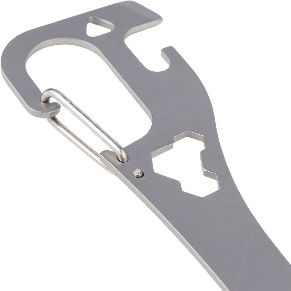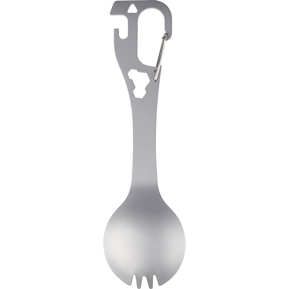 Narzędzie wielofunkcyjne zawiera: łyżkę, widelec, otwieracz do puszek i butelek, płaski śrubokręt, trzy klucze imbusowe, karabińczyk ułatwiający przypięcie, zapakowany pojedynczo w papierowe pudełko, produkt wykonany ze stali nierdzewnej 430