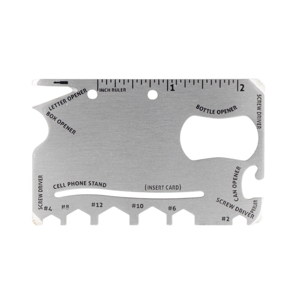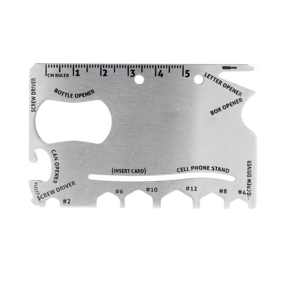 Narzędzie wielofunkcyjne w etui, posiada 9 funkcji: linijka (5 cm / 2 cale), mini wkrętak, otwieracz do kartonu, 2x wkrętak, klucze płaskie (#2, #4, #6, #8, #10, #12), podstawka pod telefon (karta nie jest dołączona), otwieracz do puszek, otwieracz do butelek, produkt wykonany ze stali nierdzewnej