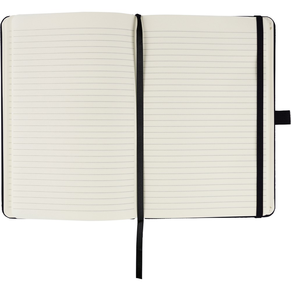 Notatnik w formacie A5, 70 g/m², posiada 70 kartek w linie, tasiemka zakładkowa umożliwia wygodne zaznaczanie ostatniej strony lub ważniejszych notatek, dodatkowe zamknięcie w postaci dopasowanej kolorystycznie elastycznej opaski, sznurek do przywiązania długopisu, ikona recyklingu z tyłu, produkt wykonany z RPET 600D i papieru