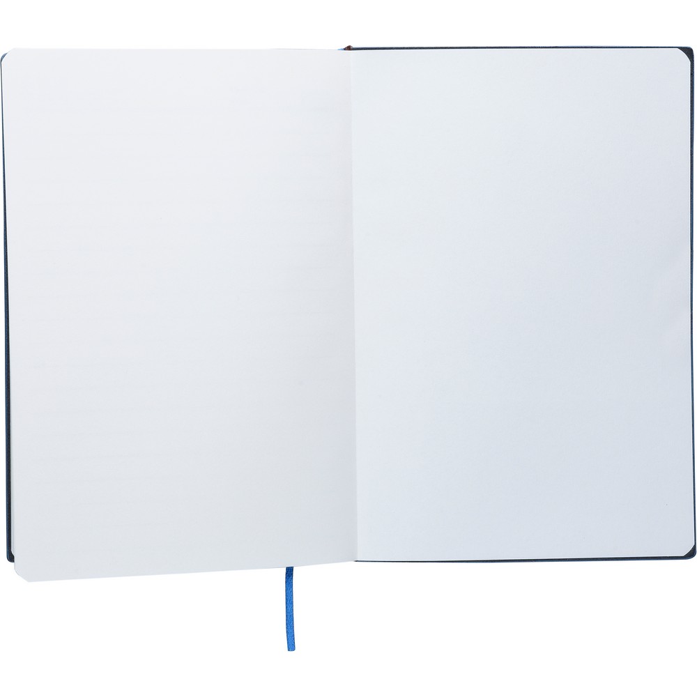 Notatnik ok. A5, 100 stron w linię (80 g/m²), twarda okładka, tasiemka zakładkowa umożliwia wygodne zaznaczanie ostatniej strony lub ważniejszych notatek, wykończenie przypominające sztruks, ikona recyklingu na produkcie, produkt wykonany z PU