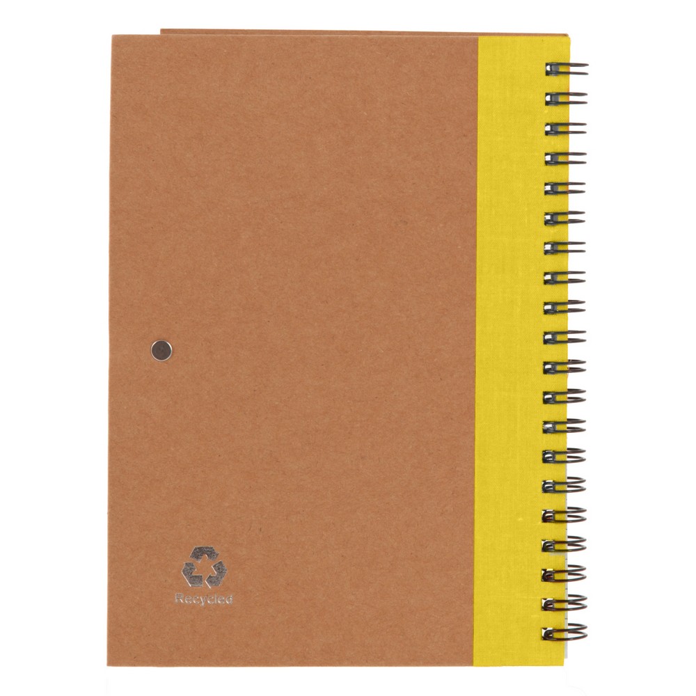 Notatnik w formacie ok. A5, posiada 60 kartek w linie (120 stron) i spiralne bindowanie, w komplecie znajduje się długopis z kolorowymi elementami, wkład w niebieskim kolorze, okładka wykonana z kartonu z kolorowym elementem przy bindowaniu