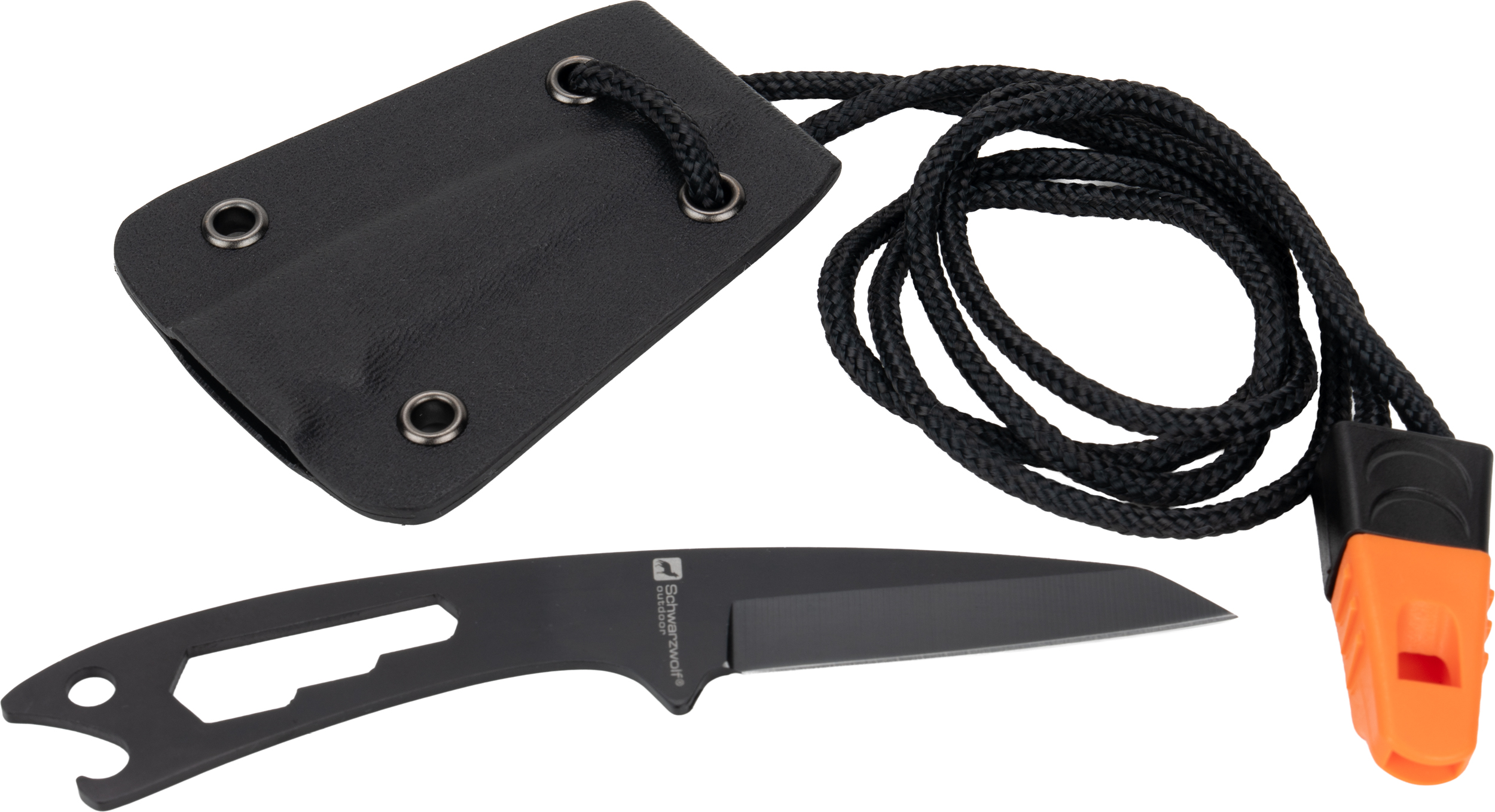 Wielofunkcyjny nóż Schwarzwolf w etui ze ściągaczem. Dzięki końcówce do dokręcania nakrętek umieszczonej przy rękojeści nóż może służyć jako otwieracz do butelek. Nóż zawiera również pomarańczowy gwizdek na sznurku. Obudowa wykonana jest ze specjalnego stopu tworzywa Kydex. Materiał: stal nierdzewna, Kydex.