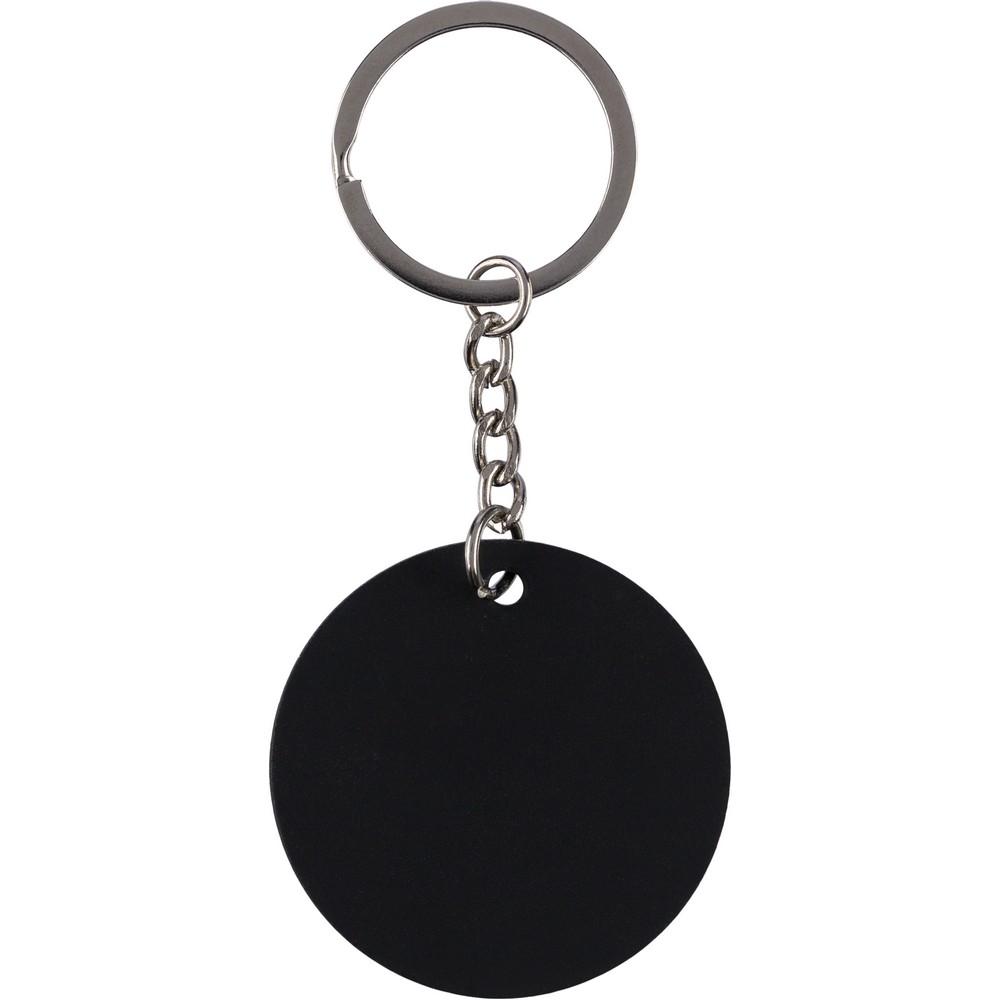 Okrągły brelok do kluczy, ikona recyklingu na produkcie, zapakowany w kraftową kopertę, produkt wykonany ze stali nierdzewnej z recyklingu
