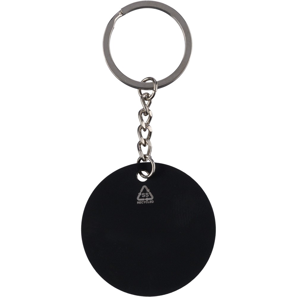 Okrągły brelok do kluczy w kształcie piłki nożnej, ikona recyklingu na produkcie, zapakowany w kraftową kopertę, produkt wykonany ze stali nierdzewnej z recyklingu
