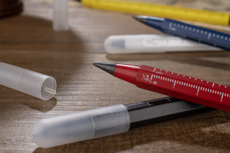 Ołówek wieczny DRAWI to praktyczny gadżet reklamowy wykonany z recyklingowanego aluminium z lakierowanym wykończeniem. Wyposażony w miarkę o długości 11 cm z podziałką w centymetrach i calach oraz touch pen, sprawdzi się w biurze, branży technicznej i budowlanej. Sześciokątny korpus zapewnia wygodny chwyt i zapobiega staczaniu się ołówka ze stołu. Zatyczka z tworzywa chroni końcówkę, co podnosi komfort użytkowania. Kompaktowy format sprawia, że DRAWI jest zawsze pod ręką i stanowi solidny nośnik reklamy dzięki możliwości znakowania.