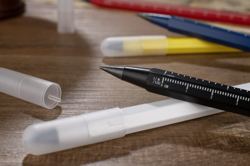 Ołówek wieczny DRAWI to praktyczny gadżet reklamowy wykonany z recyklingowanego aluminium z lakierowanym wykończeniem. Wyposażony w miarkę o długości 11 cm z podziałką w centymetrach i calach oraz touch pen, sprawdzi się w biurze, branży technicznej i budowlanej. Sześciokątny korpus zapewnia wygodny chwyt i zapobiega staczaniu się ołówka ze stołu. Zatyczka z tworzywa chroni końcówkę, co podnosi komfort użytkowania. Kompaktowy format sprawia, że DRAWI jest zawsze pod ręką i stanowi solidny nośnik reklamy dzięki możliwości znakowania.