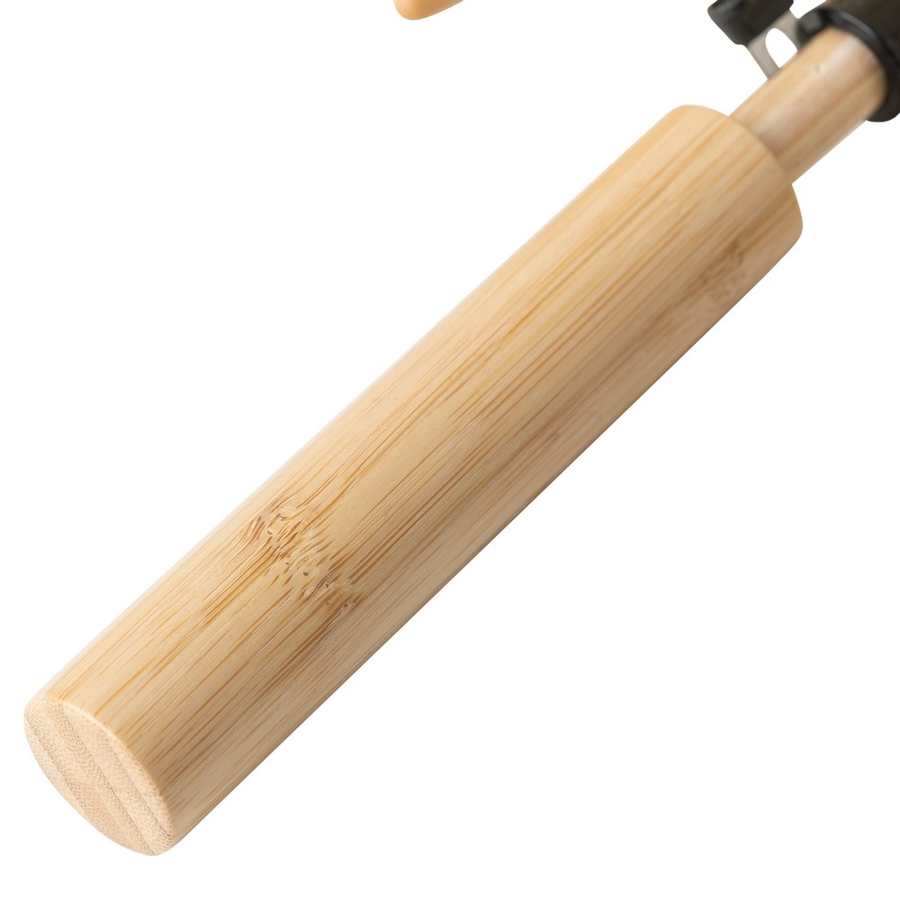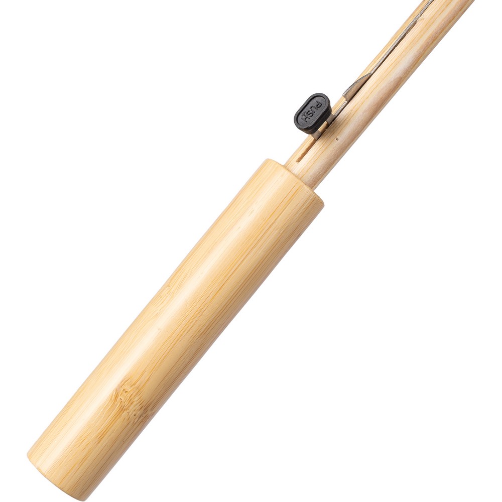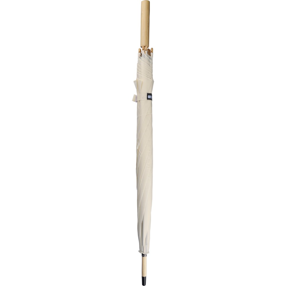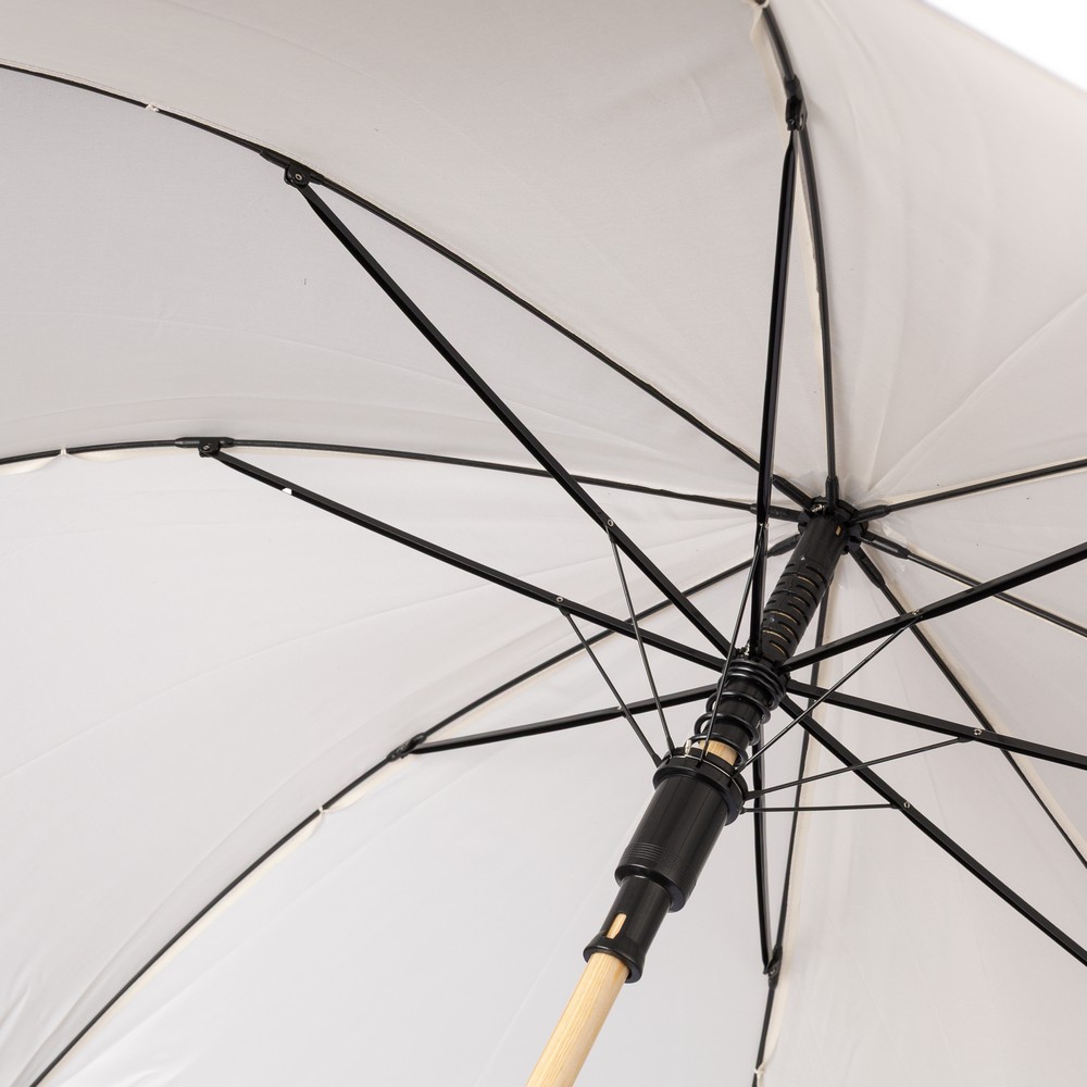 Parasol automatyczny o średnicy 23 cale, otwierany automatycznie, posiada 8 paneli, drewniany trzon i bambusową rączkę, zapinany na rzep, ikona RPET na etykiecie, produkt wykonany z tkaniny poliestrowej 190T RPET
