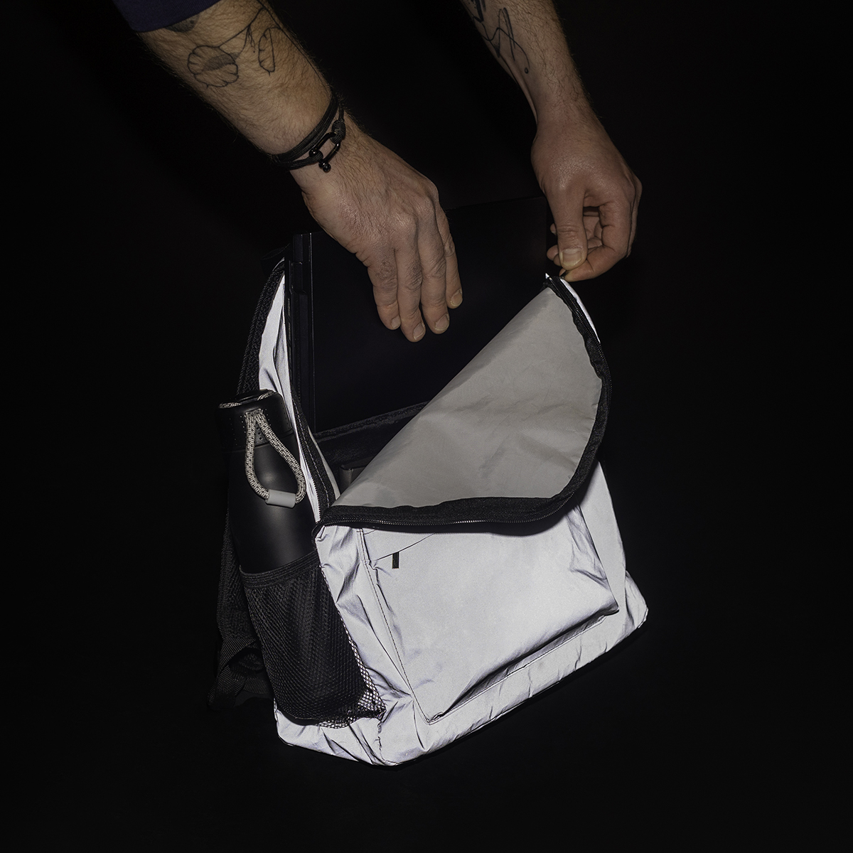 Plecak wykonany z materiału odbijającego światło. Zwiększa widoczność po zmroku. Posiada komorę główną, kieszeń na laptop 14", dwie boczne kieszonki oraz kieszeń przednią zapinaną na zamek. Usztywniane plecy zwiększające komfort noszenia.
