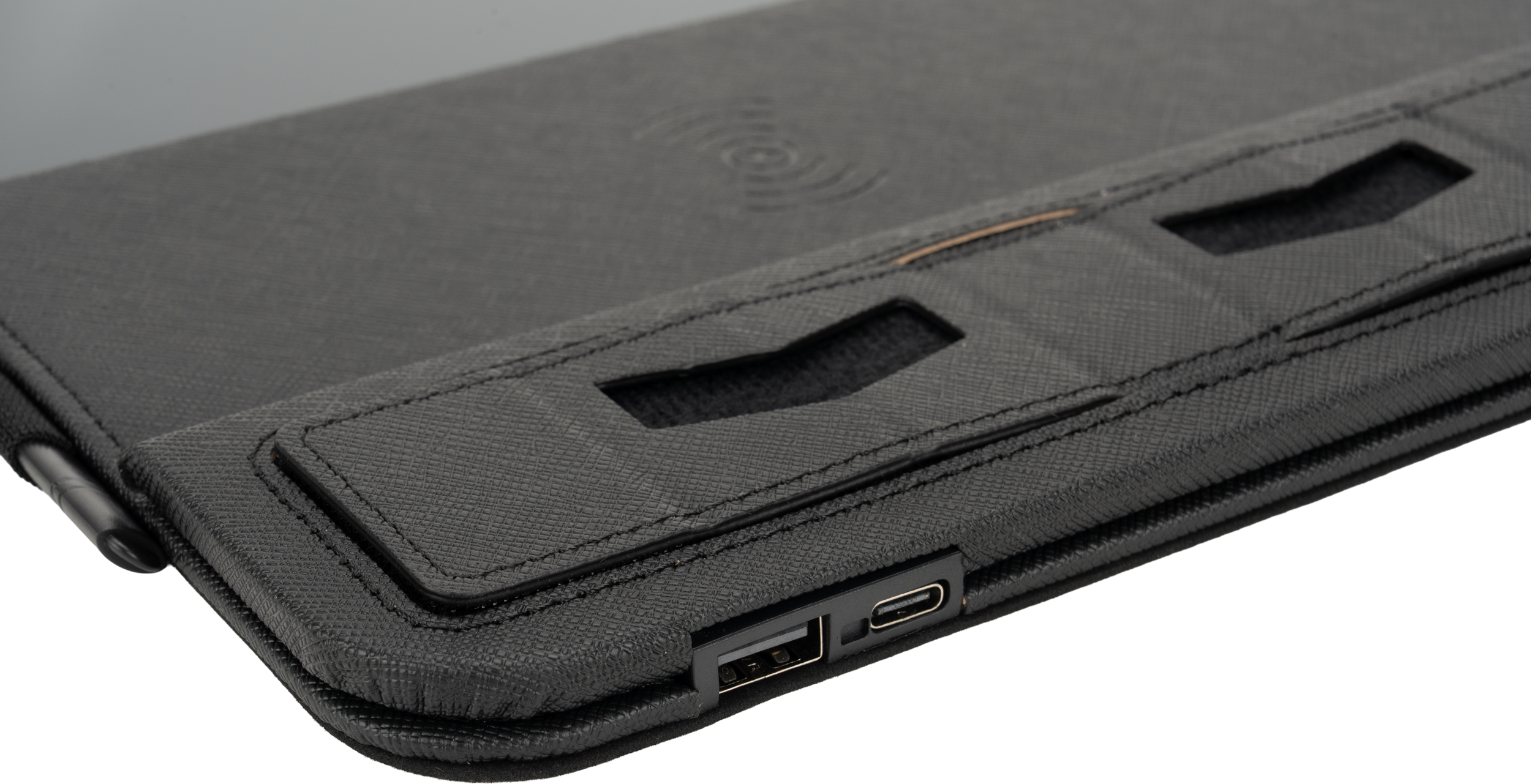 Elegancka podkładka pod mysz Pierre Cardin, wykonana z ekologicznej skóry. Podkładka zawiera ładowarkę indukcyjną 10W z wejściem 5V/2A 9V/1,67A i wyjściem 5V/1A 9V/1,1A, podstawkę na telefon komórkowy, podkładkę do pisania z rysikiem, dwie szlufki na długopisy, dodatkowe wyjście USB oraz podświetlaną plakietkę na której umieścimy Twoje logo. Podkładkę można ładować za pomocą kabla USB-C, który znajduje się w zestawie. Podkładka zapakowana w pudełko prezentowe z certyfikatem autentyczności.
