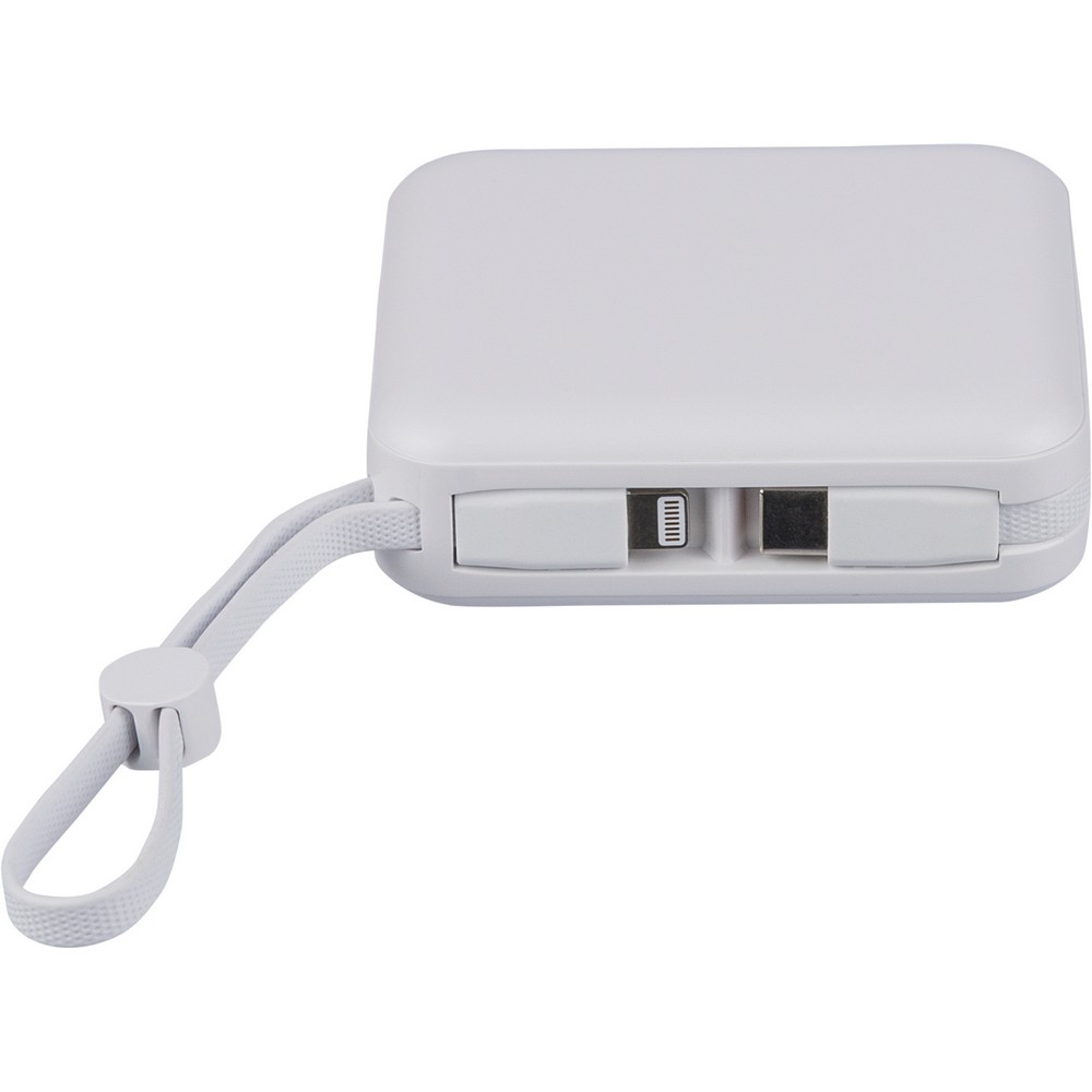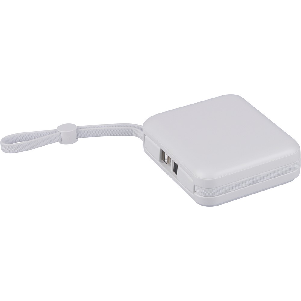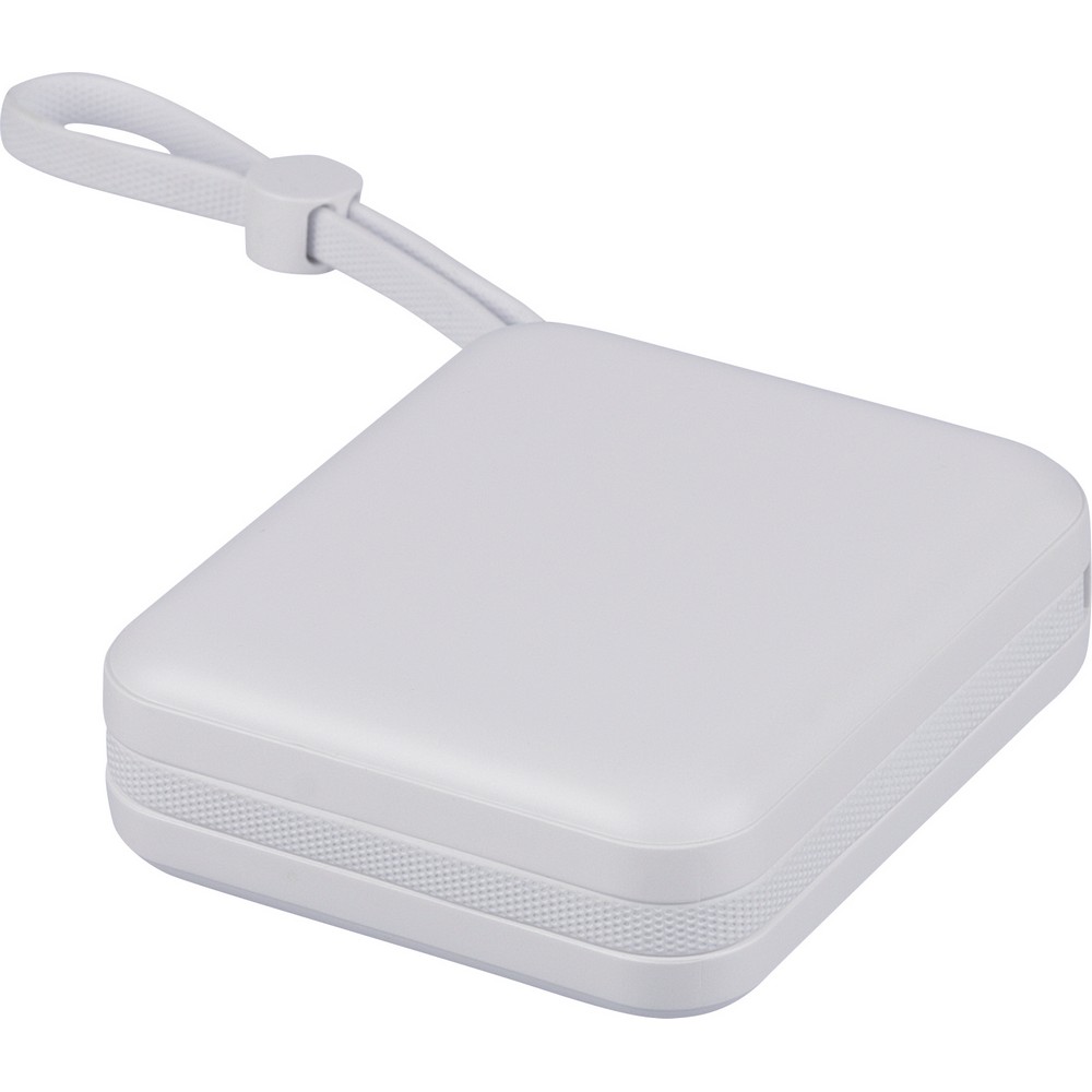 Power bank 10000 mAh, 22,5W, zestaw zawiera sznurek do przenoszenia z TPE (zintegrowany z obudową), który pełni również funkcję kabla do ładowania (USB-C i z końcówką kompatybilną z urządzeniami iOS), wskaźnik poziomu baterii na górnej części urządzenia, ikona RABS na produkcie, wejście i wyjście USB-C, wejście USB-A, w środku pudełka bibułka ochronna, bez woreczka foliowego, zawiera zabezpieczenia przed przegrzaniem, zwarciem, przepięciem i przeciążeniem prądowym, pakowany pojedynczo w brązowe pudełko kartonowe, produkt wykonany z recyklingowego ABS z baterią litowo-jonową